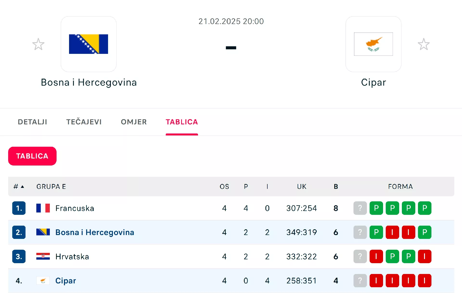 Francuska je trenutno prva u grupi s maksimalne četiri pobjede, slijedi BiH s omjerom 2:2, a isti omjer ima i Hrvatska uz lošiji međusobni skor od Zmajeva. Kipar na kontu ima sve poraze.