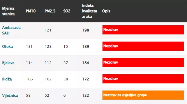 (Patria) - Zrak u Sarajevu je nezdrav, a indeks kvaliteta iznosi 198.