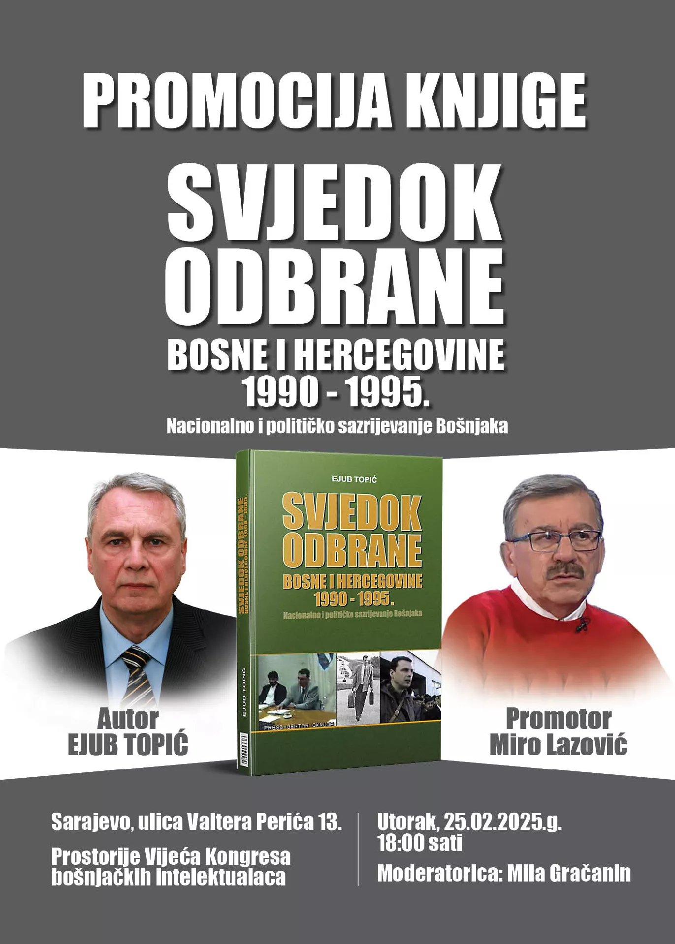 (Patria) - U Sarajevu će večeras biti upriličena promocija knjige "Svjedok odbrane Bosne i Hercegovine 1990-1995. - Nacionalno i političko sazrijevanje Bošnjaka", autora Ejuba Topića.
