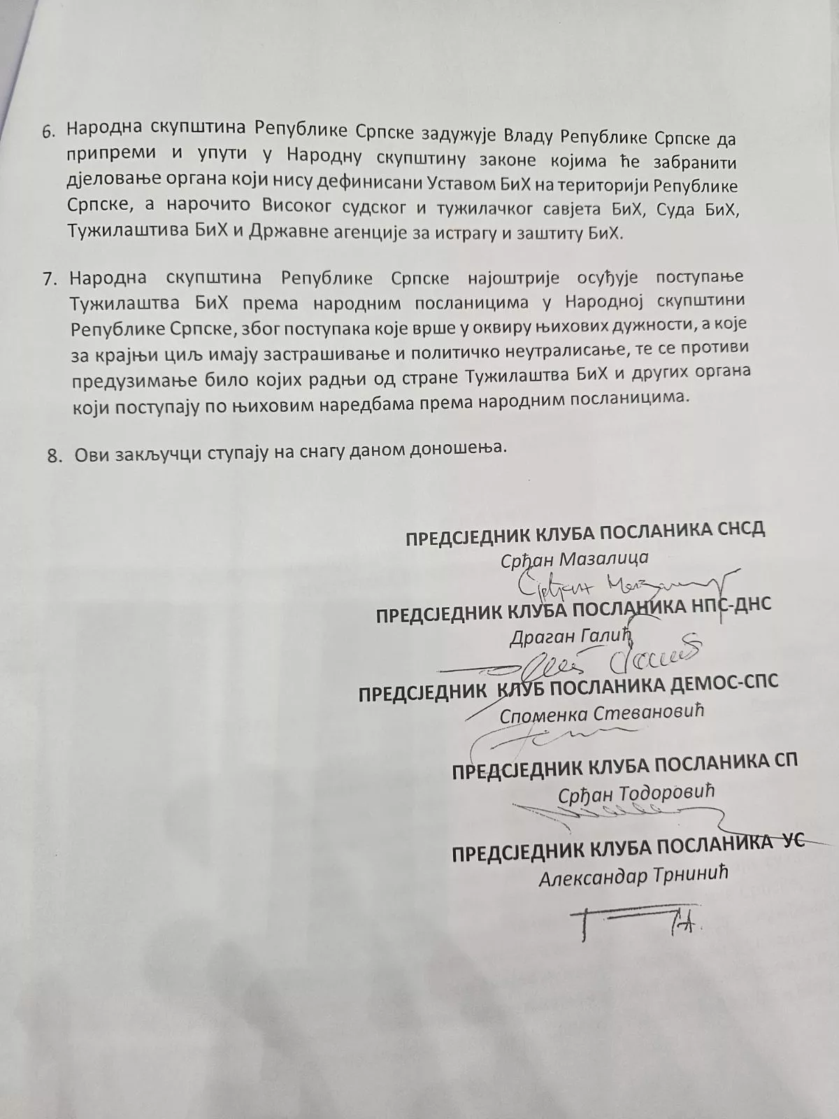 Narodna skupština "najoštrije osuđuje postupanje Tužilaštva BiH prema narodnim poslanicima u Skupštini, zbog postupaka koje vrše u okviru njihovih dužnosti, a koje za krajnji cilj imaju zastrašivanje i političko neutralisanje, te se protivi preduzimanje bilo kojih radnji od strane Tužilaštva BiH i drugih organa koji postupaju po njihovim naredbama prema narodnim poslanicima".