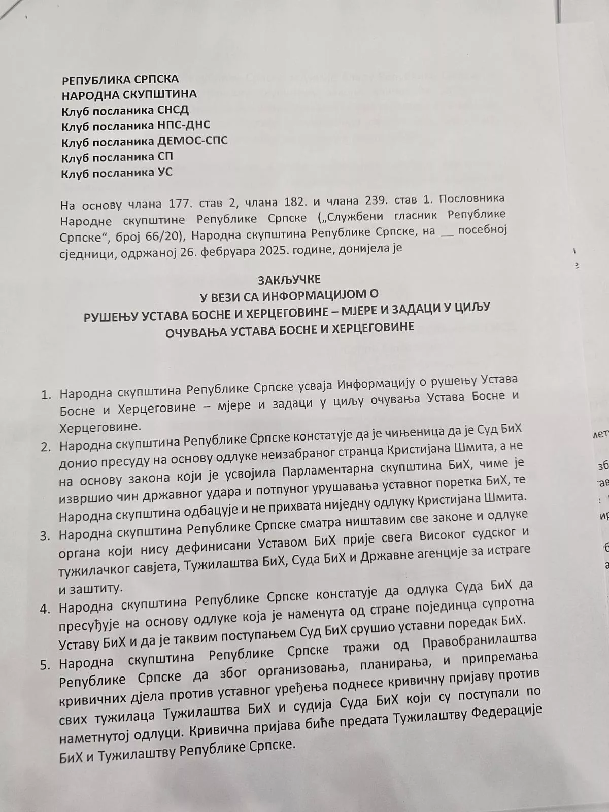 Narodna skupština konstatuje da "odluka Suda BiH da presuđuje na osnovu odluke koju je nametnuo pojedinac suprotna Ustavu BiH i da je takvim postupanjem Sud BiH srušio ustavni poredak BiH".