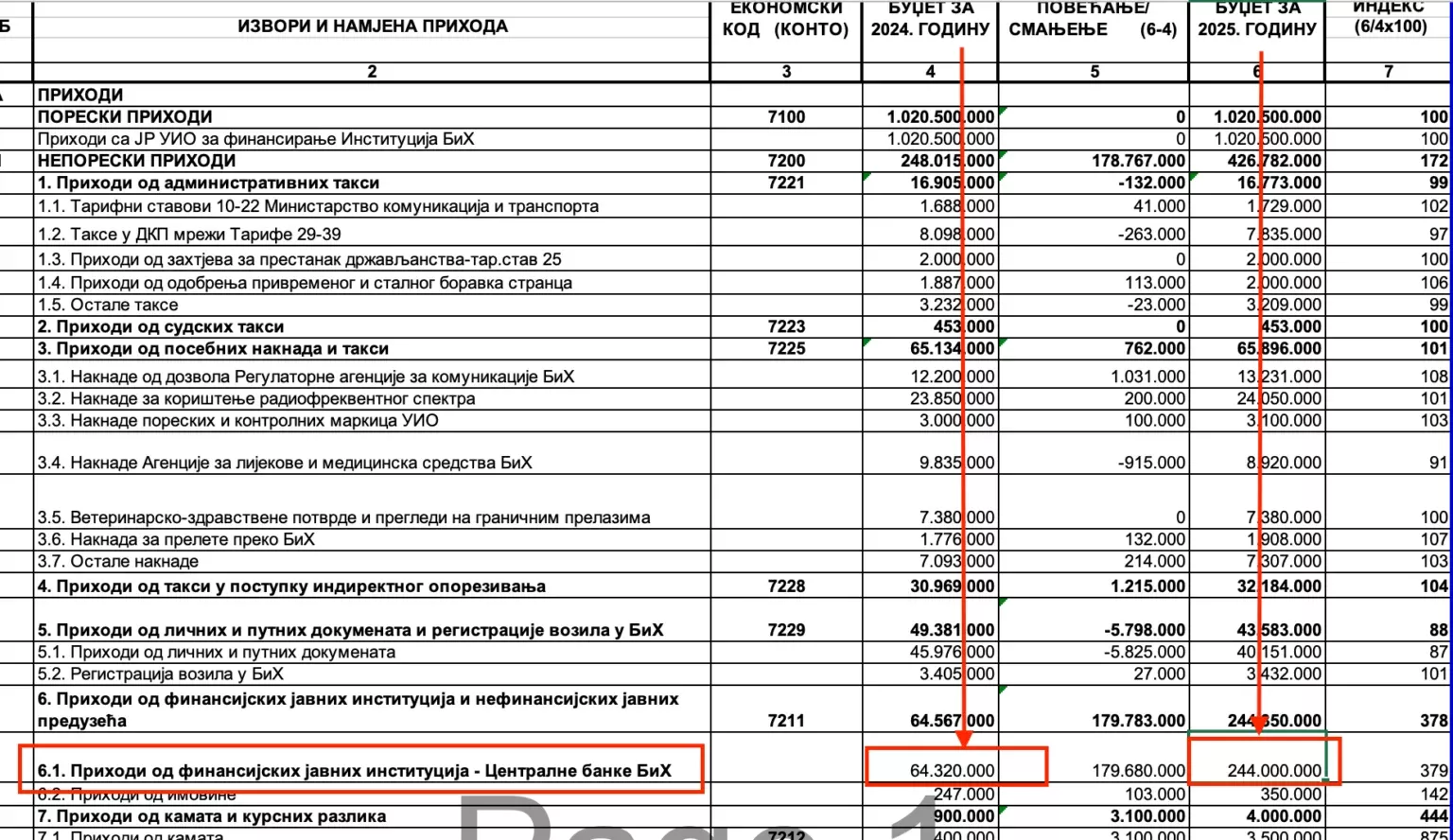 (Patria) - Nacrtom Budžeta institucija BiH za 2025. godinu koji je Vijeće ministara BiH usvojilo prošle sedmice predviđeno je povećanje prihoda od Centralne banke BiH za oko 180 miliona maraka u odnosu na prošlu godinu.