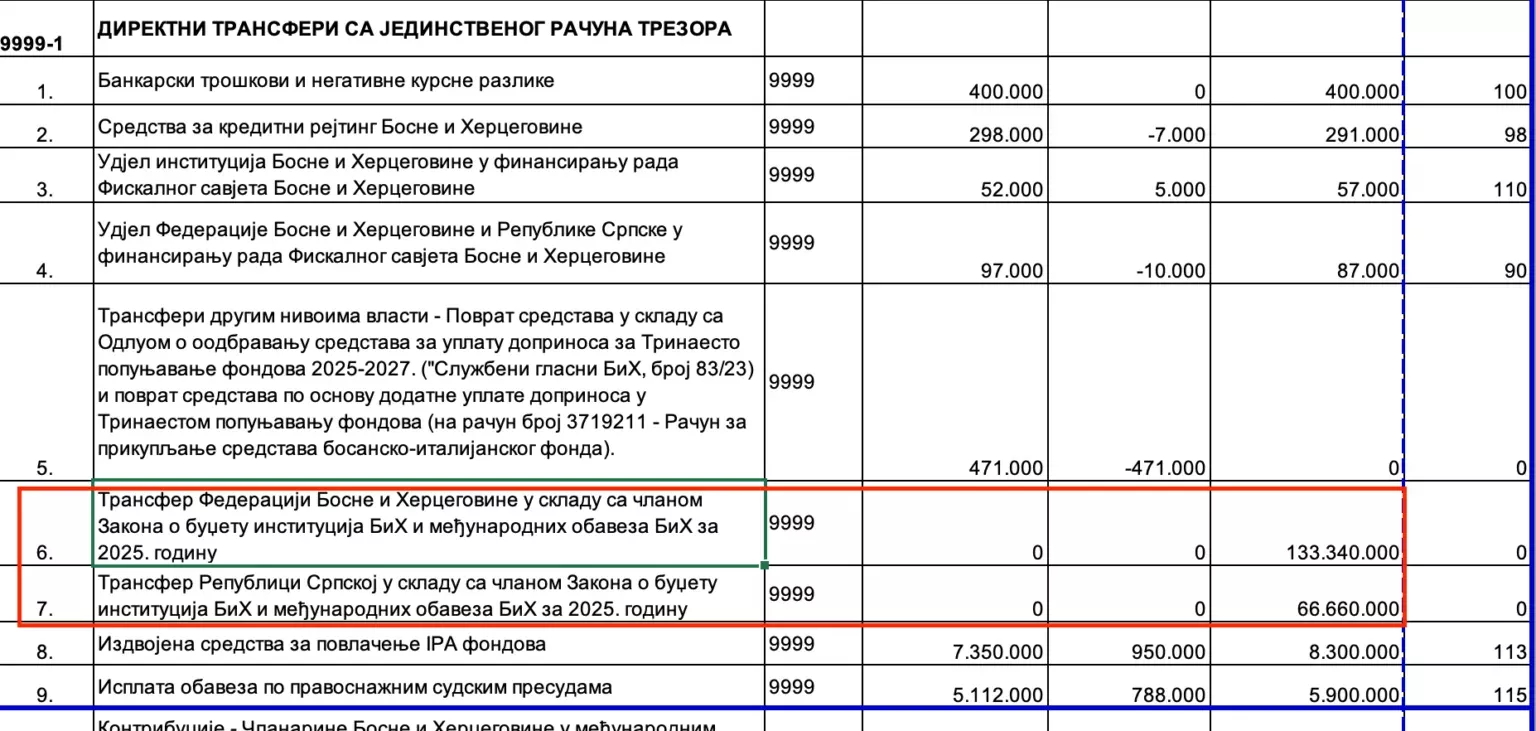 Prema Nacrtu budžeta koji će danas biti na dnevnom redu Predsjedištva BiH, u rubrici “direktni transferi sa jedinstvenog računa trezora” piše da će “u skladu sa članom Zakona o Budžetu institucija BiH za 2025. godinu” Federaciji BiH biti transferisana 133,3 miliona maraka, a Republici Srpskoj 66,6 miliona maraka. Kojim članom Zakona – nije navedeno. Ali je zato navedeno da prošle, 2024. godine iz Budžeta BiH nije transferisana nijedna marka entitetima.
