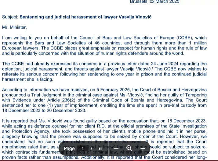 CCBE sada želi ponovo izraziti svoju ozbiljnu zabrinutost zbog presude na godinu dana zatvora i nastavka sudskog progona s kojima se suočava - navodi se u pismu upućenom i federalnom ministru Vedranu Škobiću, podsjećajući ga na pojedinosti vezane za sudski progon Vasvije Vidović.