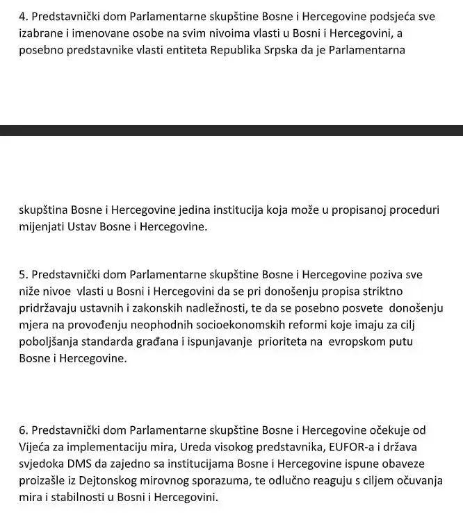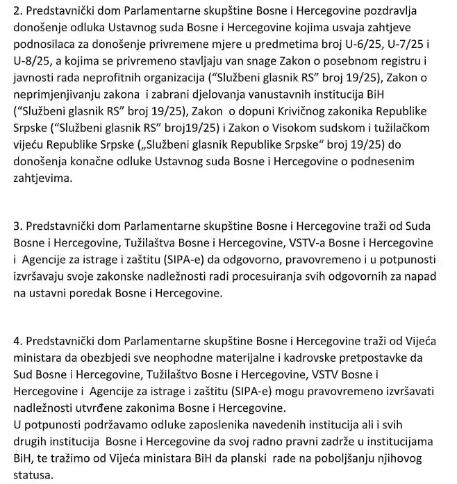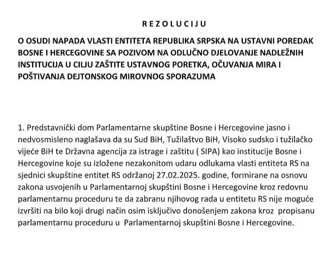"Predstavnički dom Parlamentarne skupštine Bosne i Hercegovine jasno i nedvosmisleno naglašava da su Sud BiH, Tužilaštvo BiH, Visoko sudsko i tužilačko vijeće BiH te Državna agencija za istrage i zaštitu (SIPA) kao institucije Bosne i Hercegovine koje su izložene nezakonitim odlukama vlasti entiteta Rs donesenim na sjednici Narodne skupštine Rs održanoj 27.02.2025. godine, formirane na osnovu zakona usvojenih u Parlamentarnoj skupštini Bosne i Hercegovine kroz redovnu parlamentarnu proceduru te da zabranu njihovog rada u entitetu Rs nije moguće izvršiti na bilo koji drugi način osim isključivo donošenjem zakona kroz propisanu parlamentarnu proceduru u Parlamentarnoj skupštini Bosne i Hercegovine", stoji u rezoluciji.