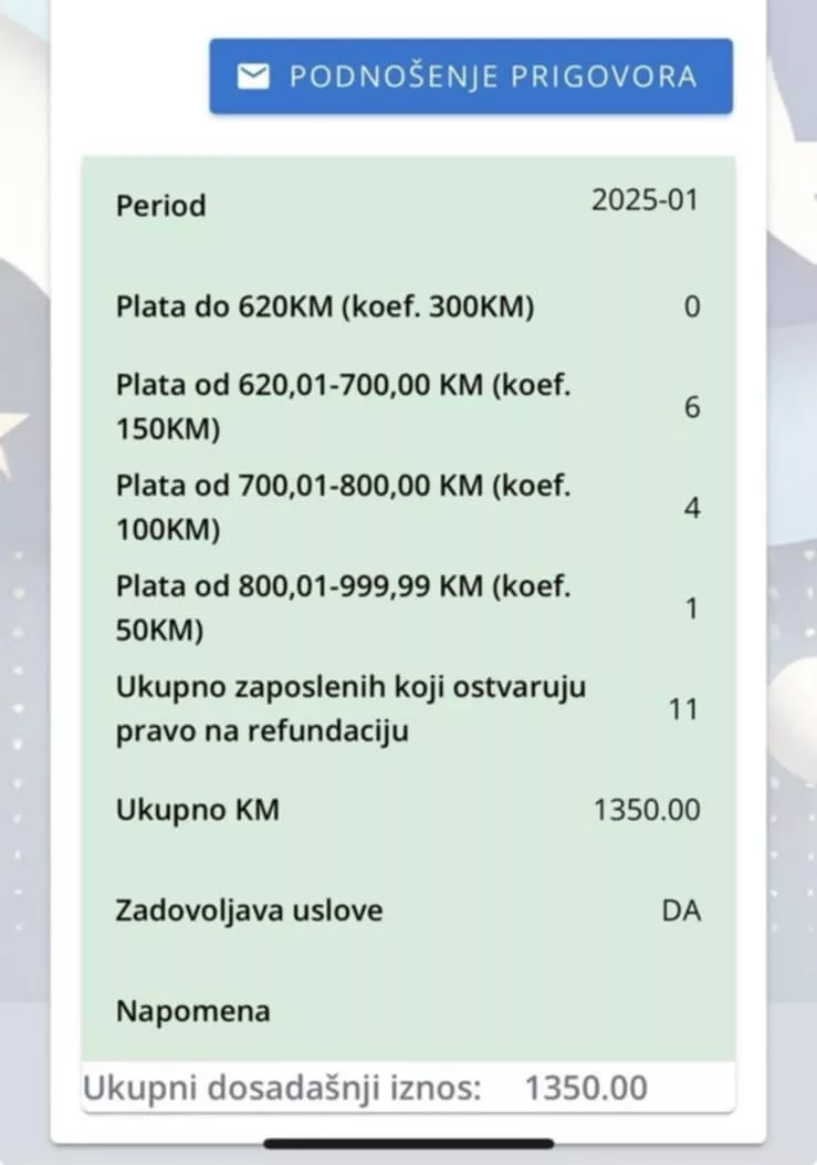 Za četiri radnika koji su imali plaću u rasponu od 700,01 do 800 KM dobio je 400 KM, iako je trošak po radniku veći od 600 KM. Za jednog radnika koji je imao plaću od 800,01 do 999 KM dobio je 50 KM, a s povećanjem plaće trošak je za tog radnika veći od 300 KM.