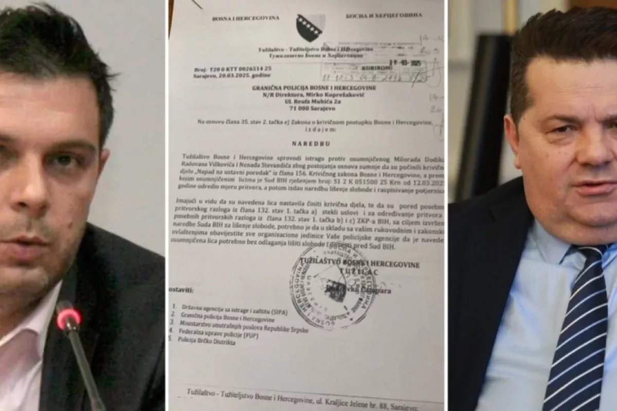 “Tužilaštvo BiH sprovodi istragu protiv osumnjičenog Milorada Dodika, Radovana Viškovića i Nenada Stevandića zbog postojanja osnovane sumnje da su počinili krivično djelo “Napad na ustavni poredak”, a prema kojim osumnjičenim licima je Sud BiH rješenjem od 12. 3. 2025. godine odredio mjeru pritvora, a potom izdao naredbu za lišenje slobode i raspisivanje potjernice. Imajući u vidu da su navedena lica nastavila činiti krivična djela, te da su pored posebnog pritvorskog razloga iz člana 132, stav 1. tačka a) (opasnost od bjekstva, op.a), stekli uslovi i za određivanje pritvora zbog posebnih pritvorskih razloga tačka b) i c) (utjecaj na svjedoke i ponavljanje krivičnog djela op.a.), sa ciljem izvršenja naredbe Suda BiH za lišenje slobode, potrebno je da u skladu sa vašim rukovodnim i zakonskim ovlaštenjima obavijestite sve organizacione jedinice vaše policijske agencije da je navedena osumnjičena lica potrebno bez odlaganja lišiti slobode i dovesti pred Sud BiH”, naveo je tužilac Čampara.