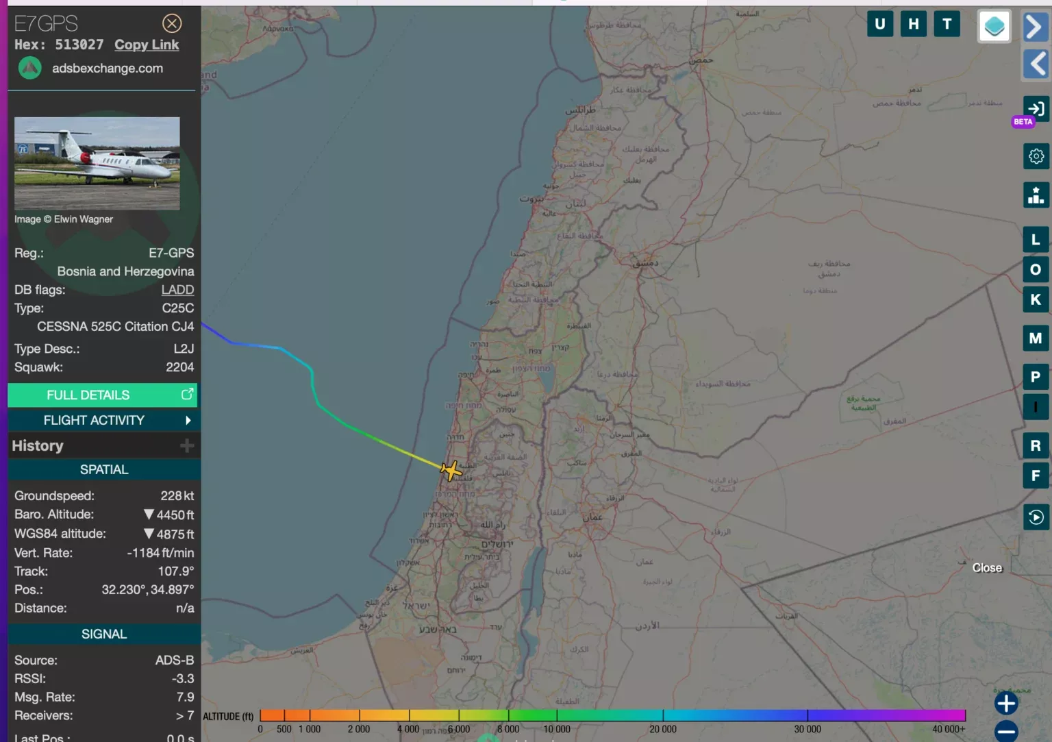 Na jednoj od stranica za praćenje letova može se vidjeti da je avion Cesna E7 GPS koji je u vlasništvu Vlade RS već iznad Izraela.