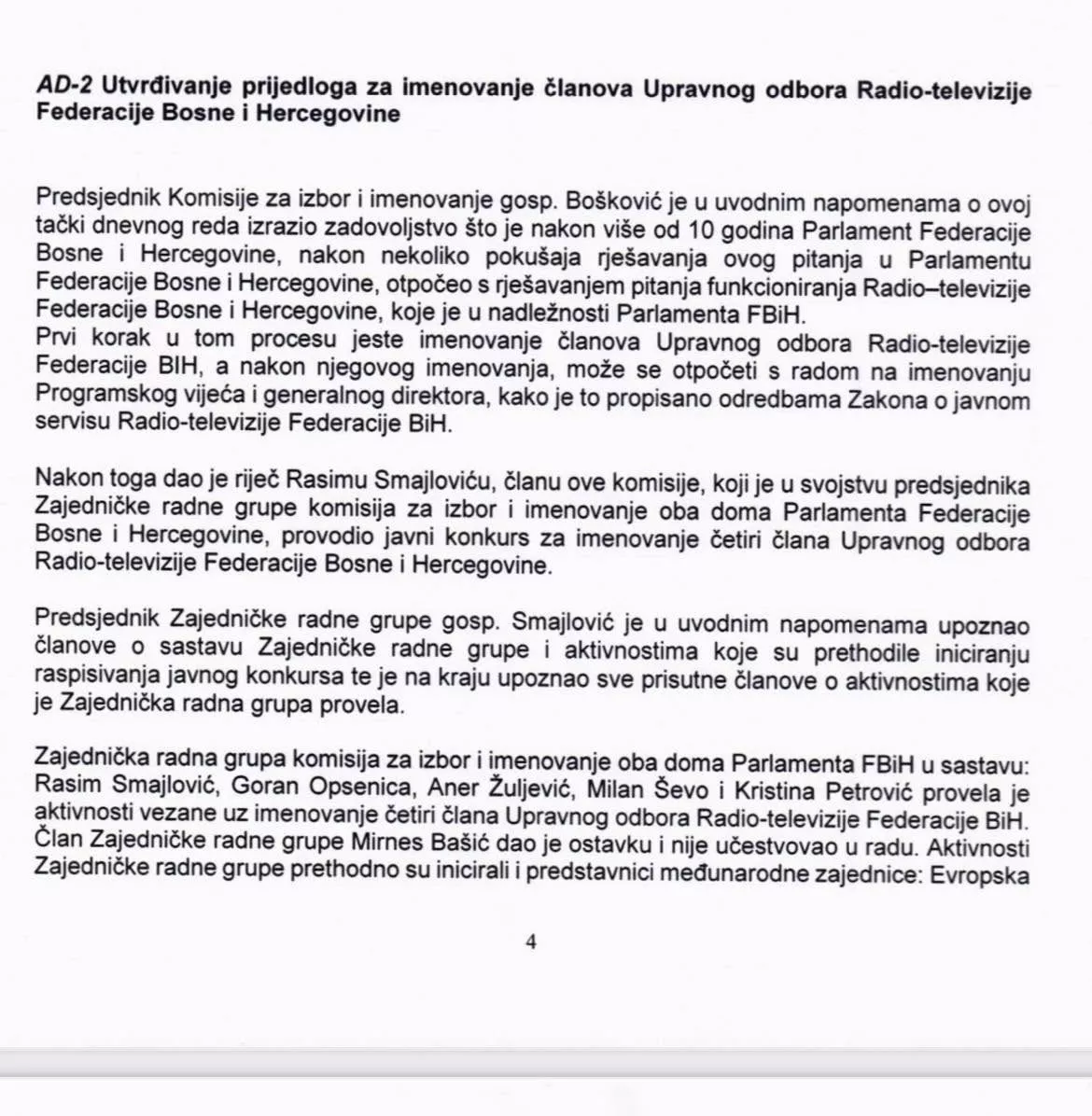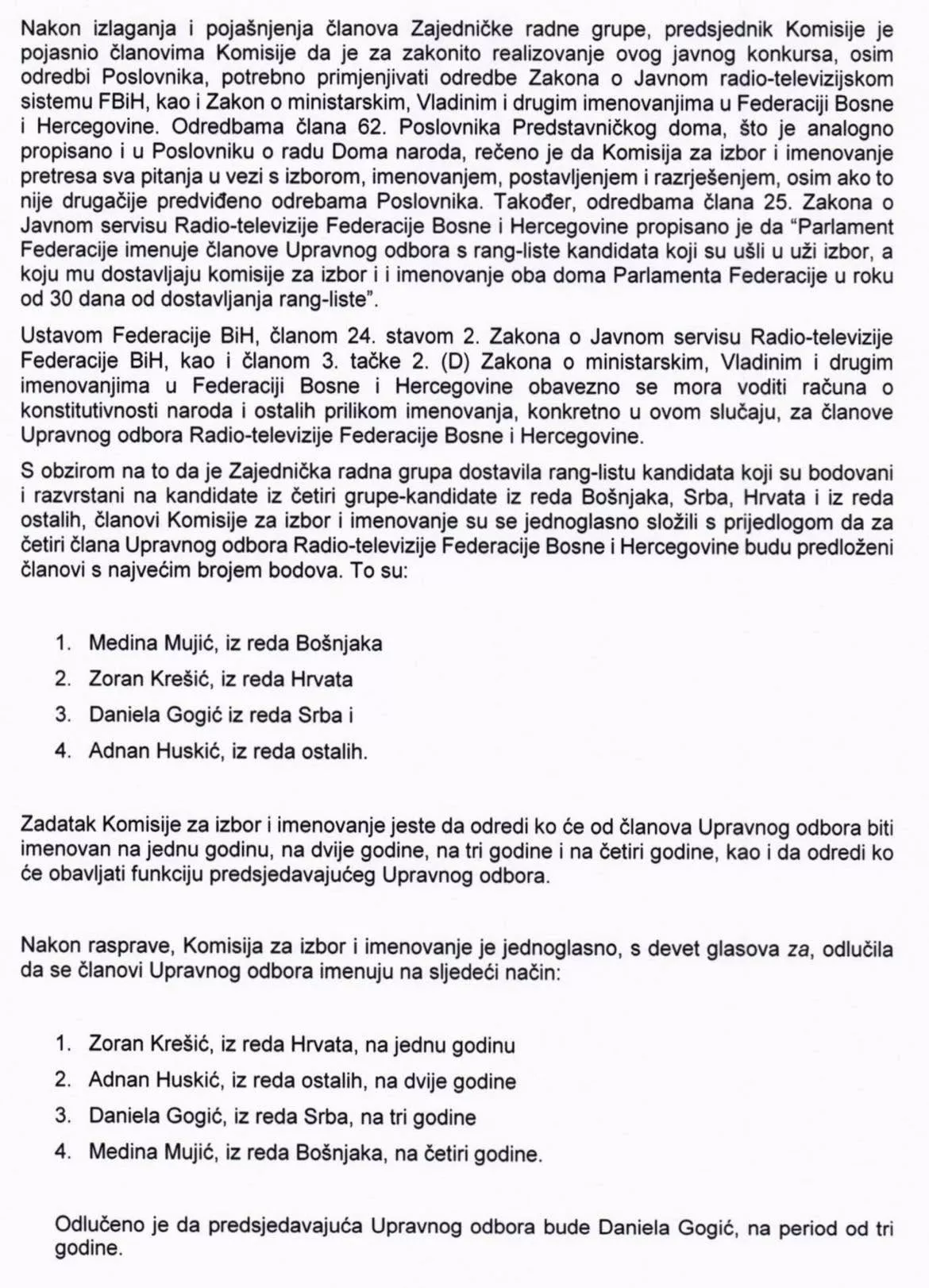 Radna grupa oba doma Parlamenta FBiH, u sastavu: Rasim Smajlović (NiP), Aner Žuljević (SDP), Mladen Bošković (HDZ), Goran Opsenica (HDZ), Milan Ševo (HDZ) i Kristina Petrović (SDP) uz asistenciju Dragana Miokovića (NS) i Mladena Boškovića (HDZ) dala je prijedlog kandidata za UO FTV BiH.