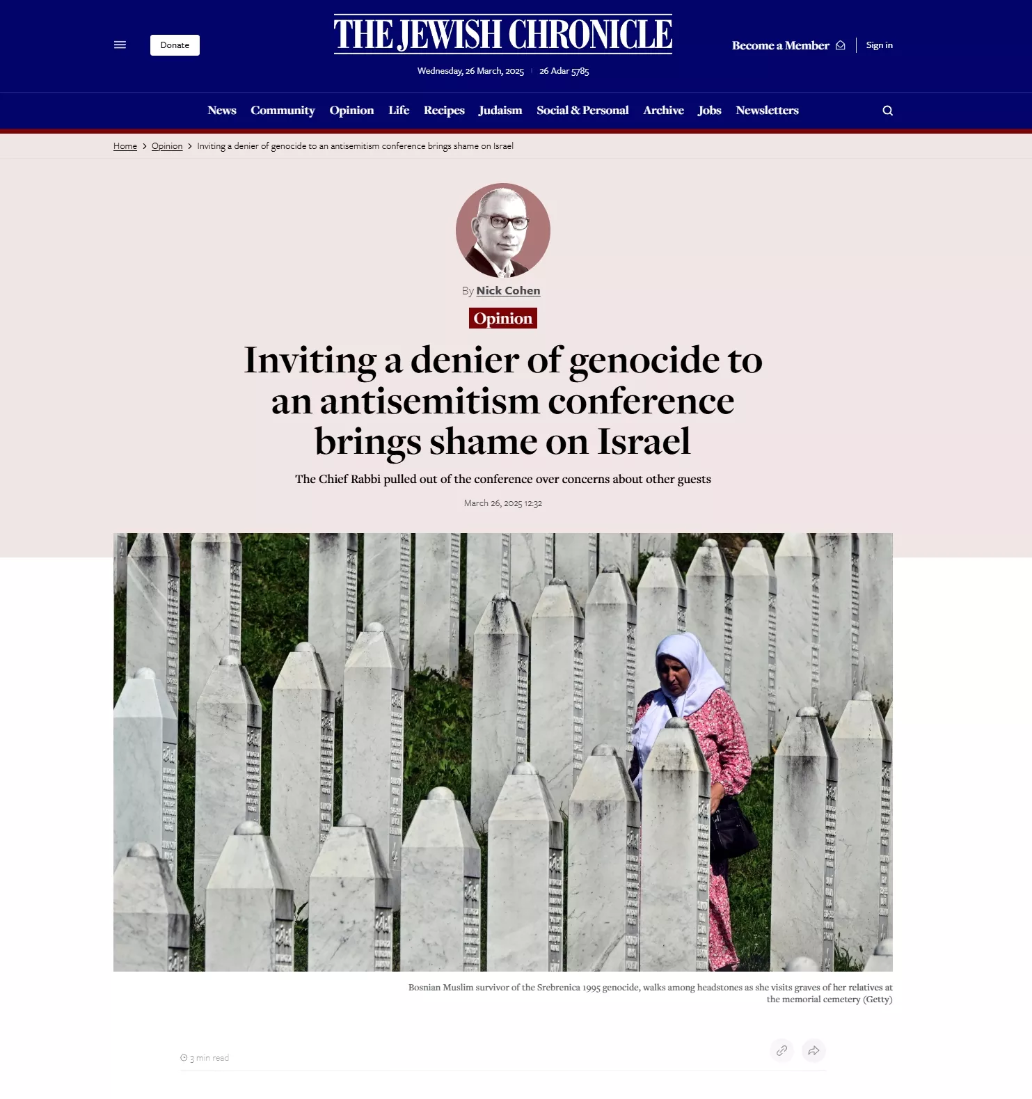 Jevrejski medij: Poziv negatoru genocida je sramota za Izrael
