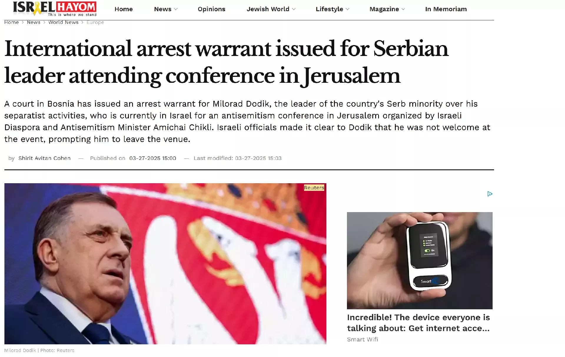 Ovaj medij sa sjedištem u Tel Avivu je naveo da je "sud u Bosni i Hercegovini izdao nalog za hapšenje Milorada Dodika, lidera srpske manjine u zemlji zbog njegovih separatističkih aktivnosti".