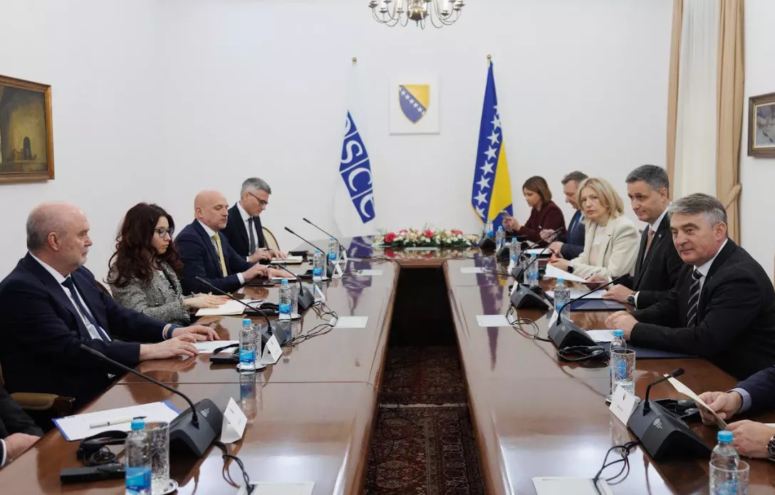 Članovi Predsjedništva BiH Komšić i Bećirović poželjeli su dobrodošlicu generalnom sekretaru OSCE-a Sinirlioğluu, istaknuvši da se njegova posjeta Bosni i Hercegovini poklapa sa delikatnom situacijom u kojoj se zemlja nalazi.