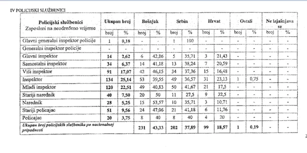 Kada je riječ o policijskim službenicima Bošnjaka je 231, Srba 202, Hrvata 99, te jedan iz reda ostalih.