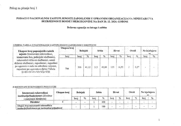 (Patria) - U Državnoj agenciji za istrage i zaštitu (SIPA) otkako je osnovana 2002. godine prvi put je više Srba nego Bošnjaka. Pokazuju to podaci iz decembra 2024. godine, a u odgovoru koji je Vijeće ministara BiH utvrdilo na sjednici 17. marta ove godine na jedno zastupničko pitanje.