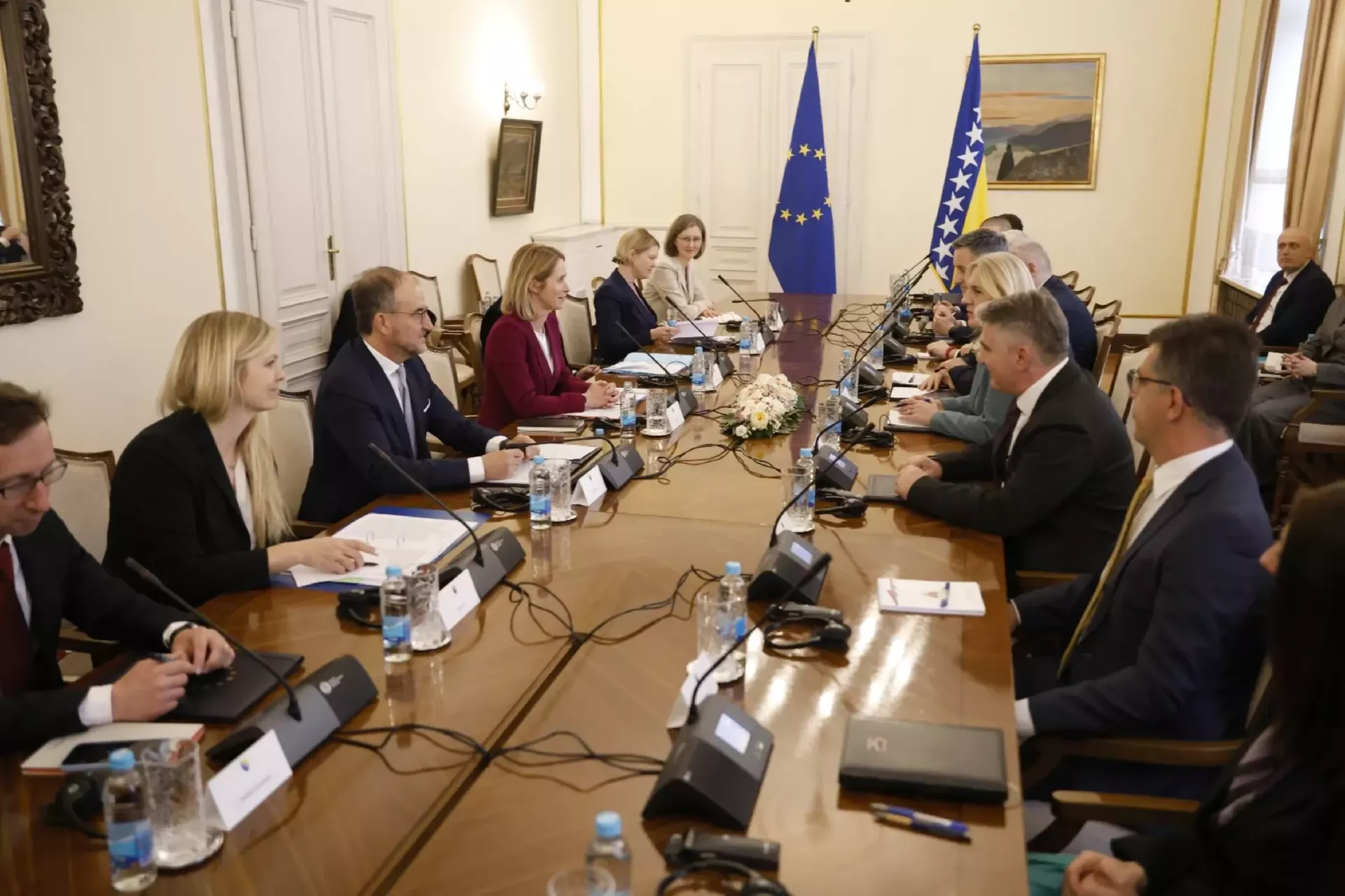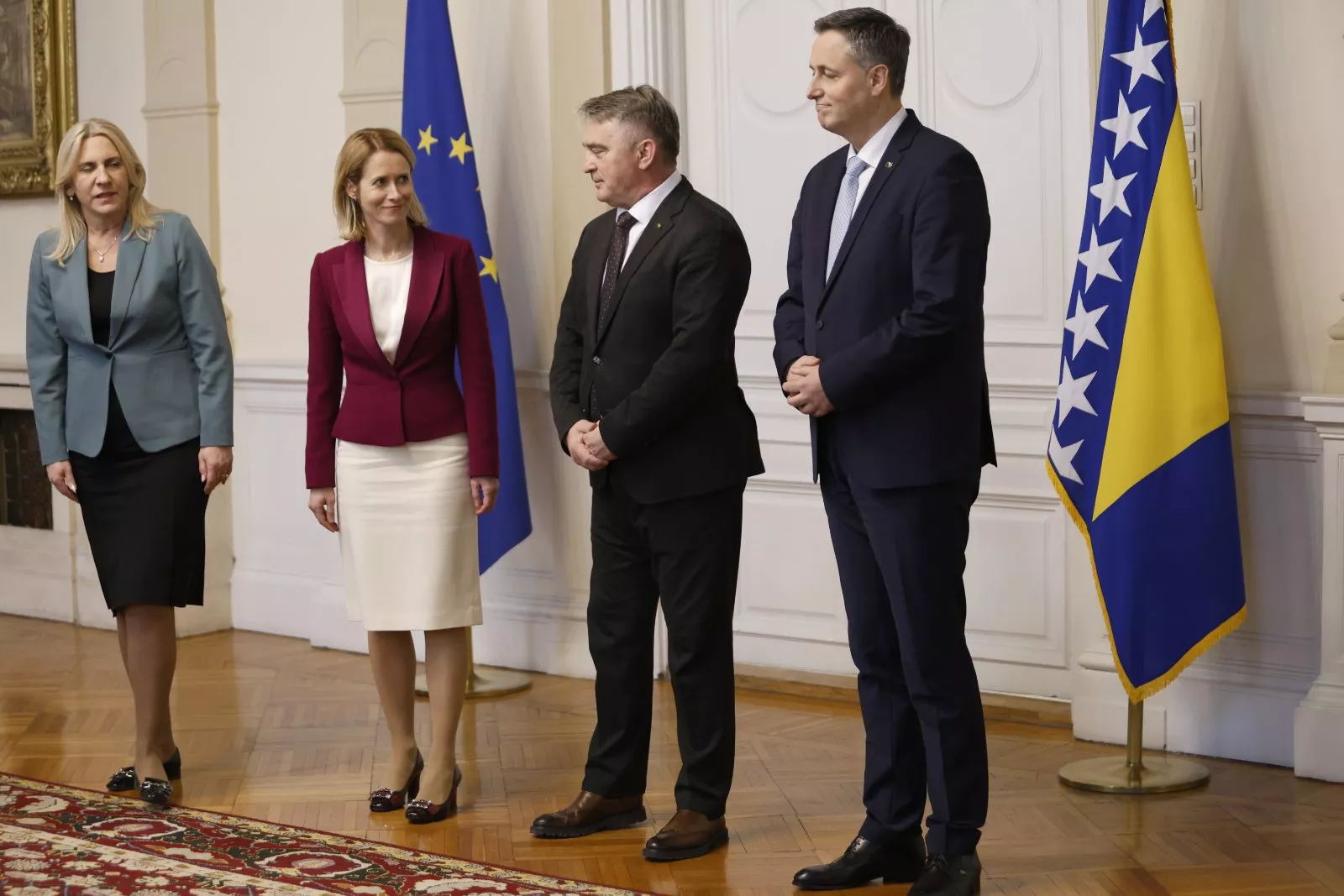 Kallas su u zgradi Predsjedništva BiH primili predsjedavajuća Željka Cvijanović i članovi kolektivnog šefa države Željko Komšić i Denis Bećirović. Sastanku prisustvuje i šef Delegacije EU u BiH Luigi Soreca.