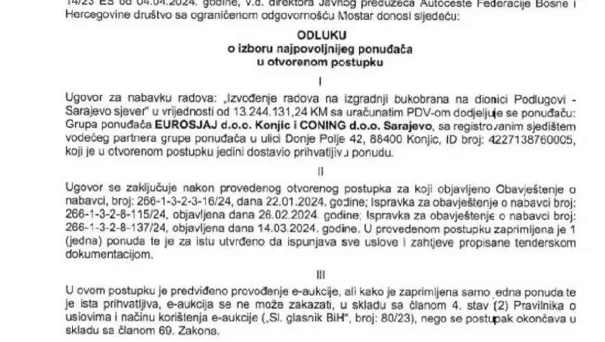 (Patria) - Javno preduzeće Autoceste FBiH ponovo bi se moglo naći pod lupom javnosti ali i pravosudnih organa zbog sumnjive dodjele ugovora vrijednog 13.244.131,24 sa uračunatim PDV-om za izgradnju bukobrana na dionici Podlugovi – Sarajevo sjever.