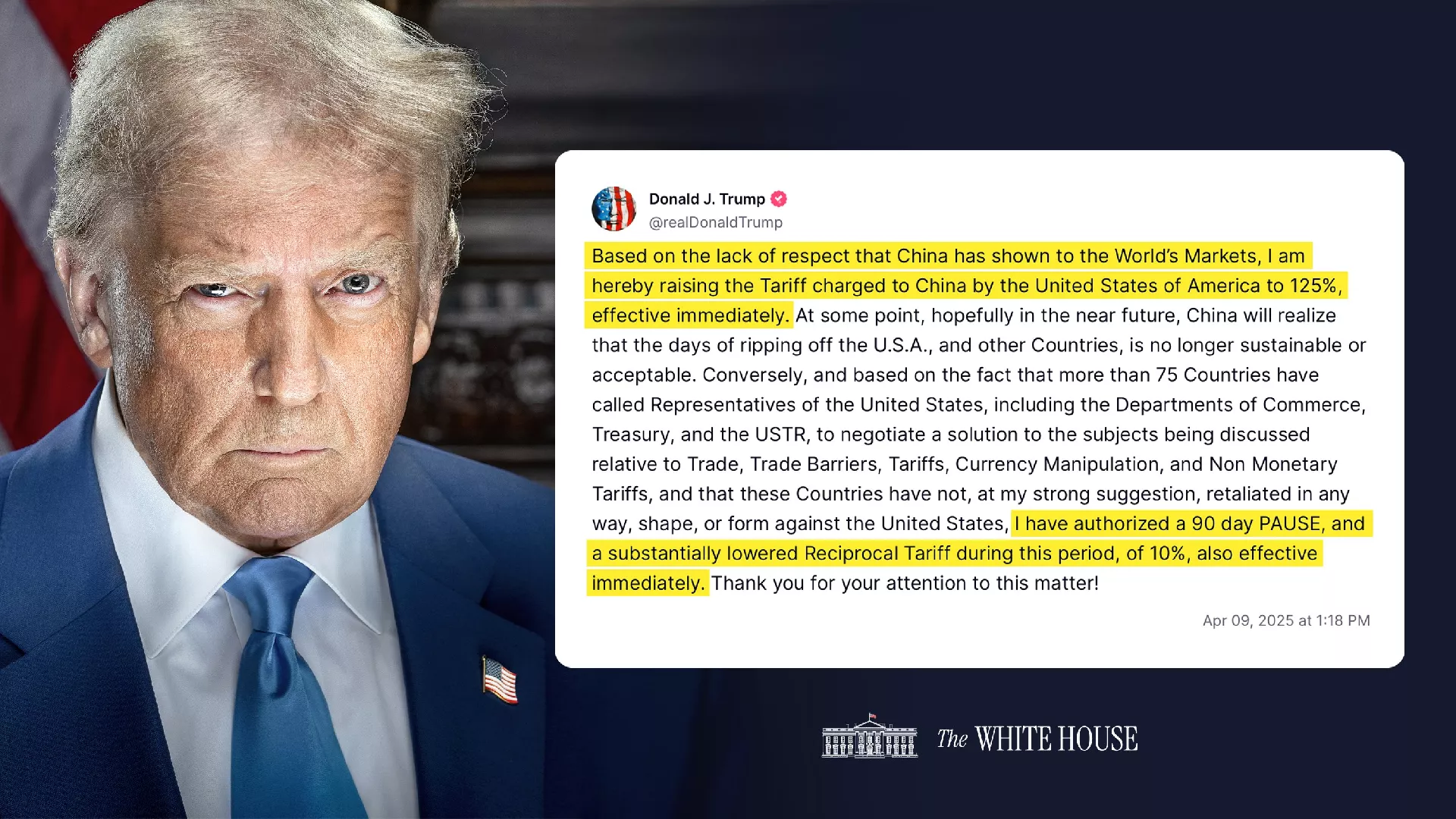 S druge strane, i na temelju činjenice da je više od 75 zemalja pozvalo predstavnike SAD-a, uključujući Ministarstvo trgovine, Ministarstvo finansija i Ured trgovinskog predstavnika, da pregovaraju o rješenju za teme koje se razmatraju u vezi s trgovinom, trgovinskim barijerama, carinama, manipulacijom valutama i ne-monetarnim carinama, a te zemlje nisu, po mom snažnom prijedlogu, poduzele nikakve mjere odmazde protiv SAD-a, autorizovao sam 90-dnevnu pauzu i znatno nižu recipročnu carinu od 10% tokom ovog perioda, koja također stupa na snagu odmah.