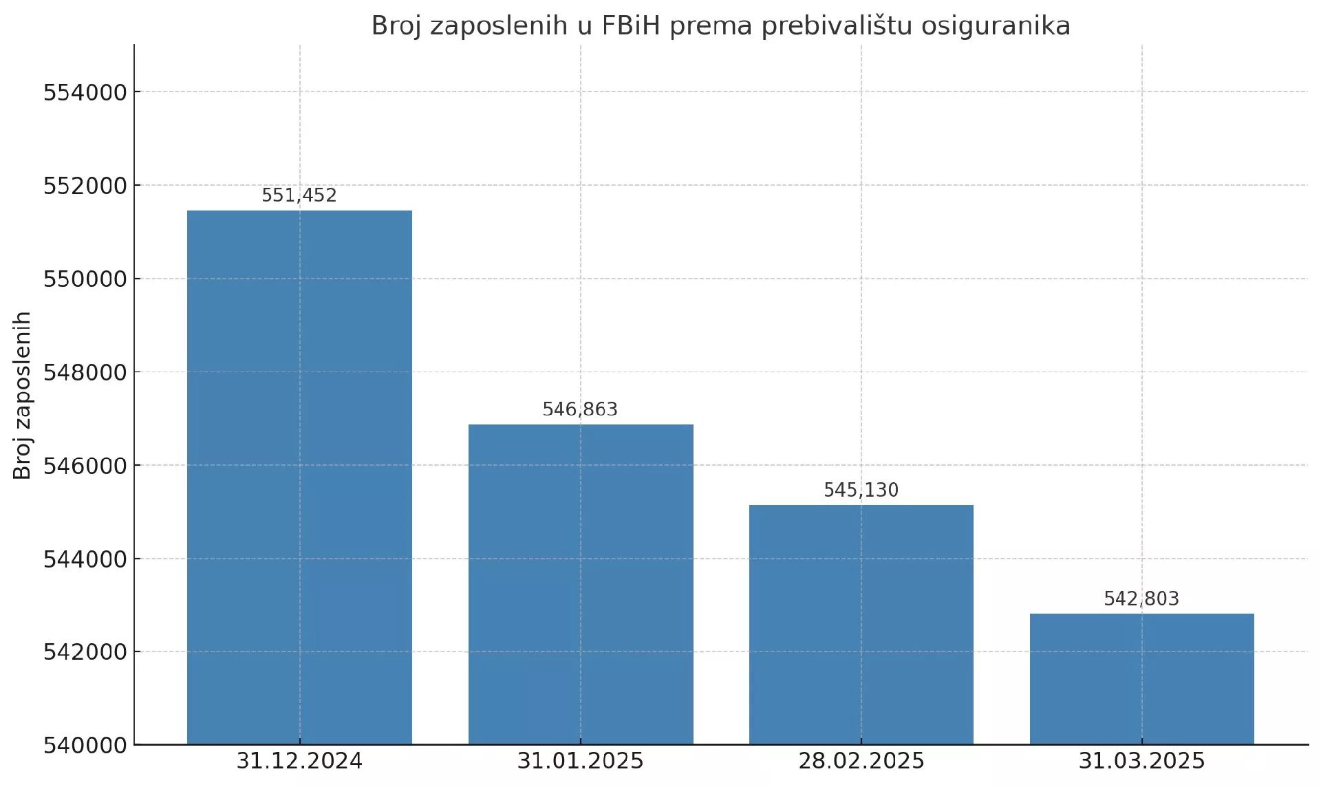 Razlika u broju zaposlenih u Federaciji BiH od 1. januara 2025. do 31. marta 2025. godine iznosi 8.649 što pokazuje da se u FBiH ipak povećava broj osoba koje ostaju bez posla ili iz nekog drugog razloga prekidaju radni odnos (smrt, penzija, odlazak iz BiH).