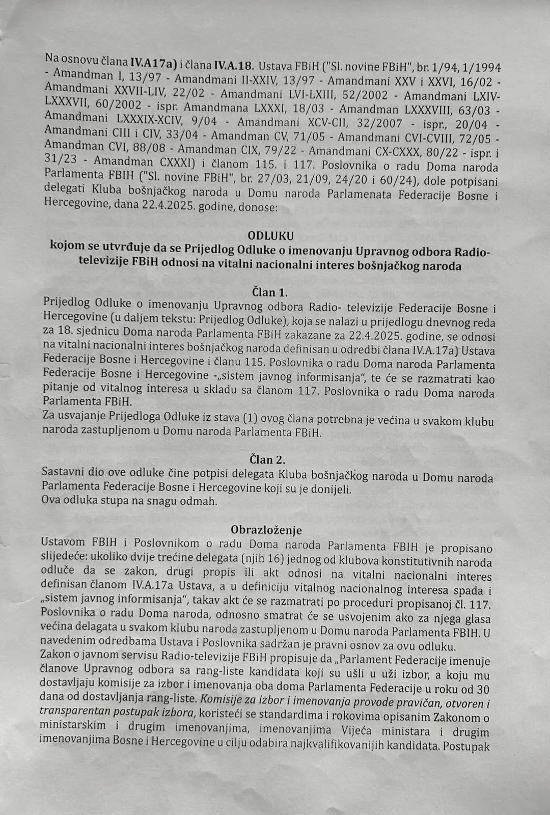 Iz ovog Kluba ističu da se Prijedlog odluke o imenovanju UO RTV FBiH, koji se nalazi na dnevnom redu današnje sjednice, odnosi na vitalni nacionalni interes bošnjačkog naroda definisan u odredbi člana IV.A.17a) Ustava FBiH i članu 115. Poslovnika o radu Doma naroda Parlamenta FBiH - "sistem javnog informisanja" te će se razmatrati kao pitanje od vitalnog interesa u skladu sa članom 117. Poslovnika o radu Doma naroda Parlamenta FBiH.