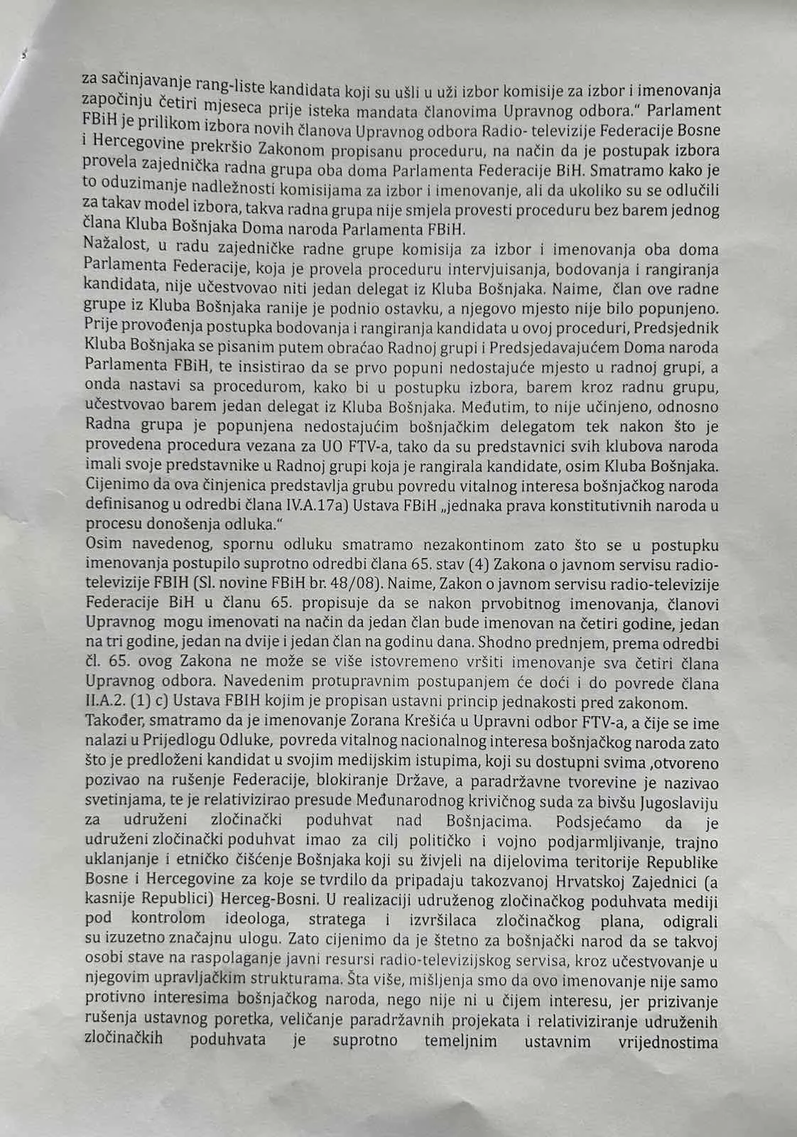 Također, smatramo da je imenovanje Zorana Krešića u Upravni odbor FTV-a, a čije se ime nalazi u Prijedlogu odluke, povreda vitalnog nacionalnog interesa bošnjačkog naroda zato što je predloženi kandidat u svojim medijskim istupima, koji su dostupni svima, otvoreno pozivao na rušenje Federacije, blokiranje države, a paradržavne tvorevine je nazivao svetinjama, te je relativizirao presude Međunarodnog krivičnog suda za bivšu Jugoslaviju za udruženi zločinački poduhvat nad Bošnjacima.