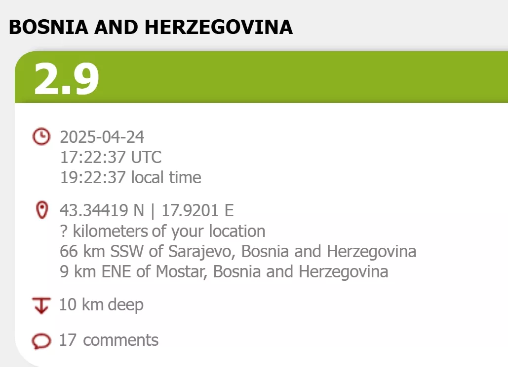 (Patria) - Zemljotres jačine 2,9 stepeni po Richteru pogodio je u večernjim satima Hercegovinu.