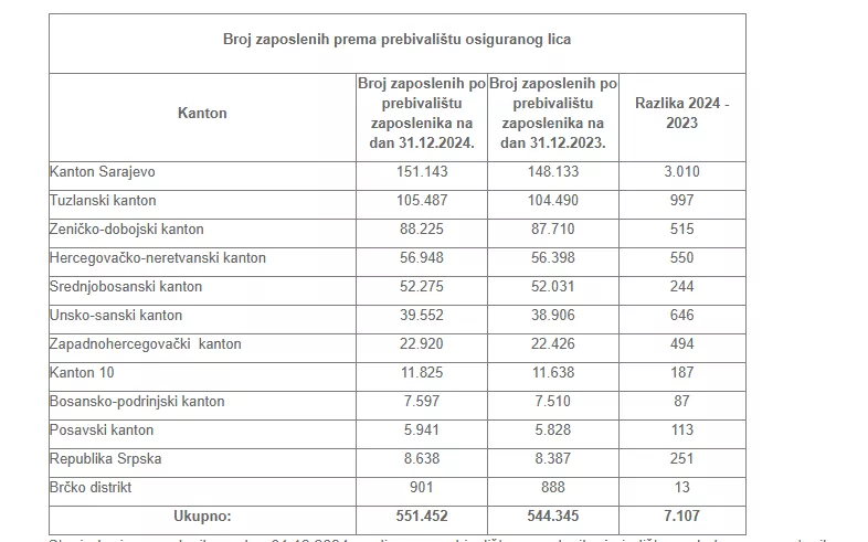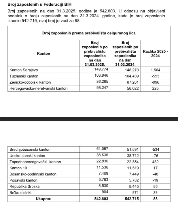 Porezna uprava FBiH 17. januara ove godine dostavila je tabelu zaposlenih u FBiH u kojoj je broj zaposlenih iznosio iznosio 551.452. Posljednje saopćenje Porezne uprave FBiH o naplati javnih prihoda mediji su dobili 9. aprila. U tabeli broja zaposlenih primjetna razlika. Na datum 31.03.2025. godine u FBiH je 542.803 zaposlenih osoba. Razlika broja zaposlenih na kraju decembra i krajem marta je 8.649 osoba.