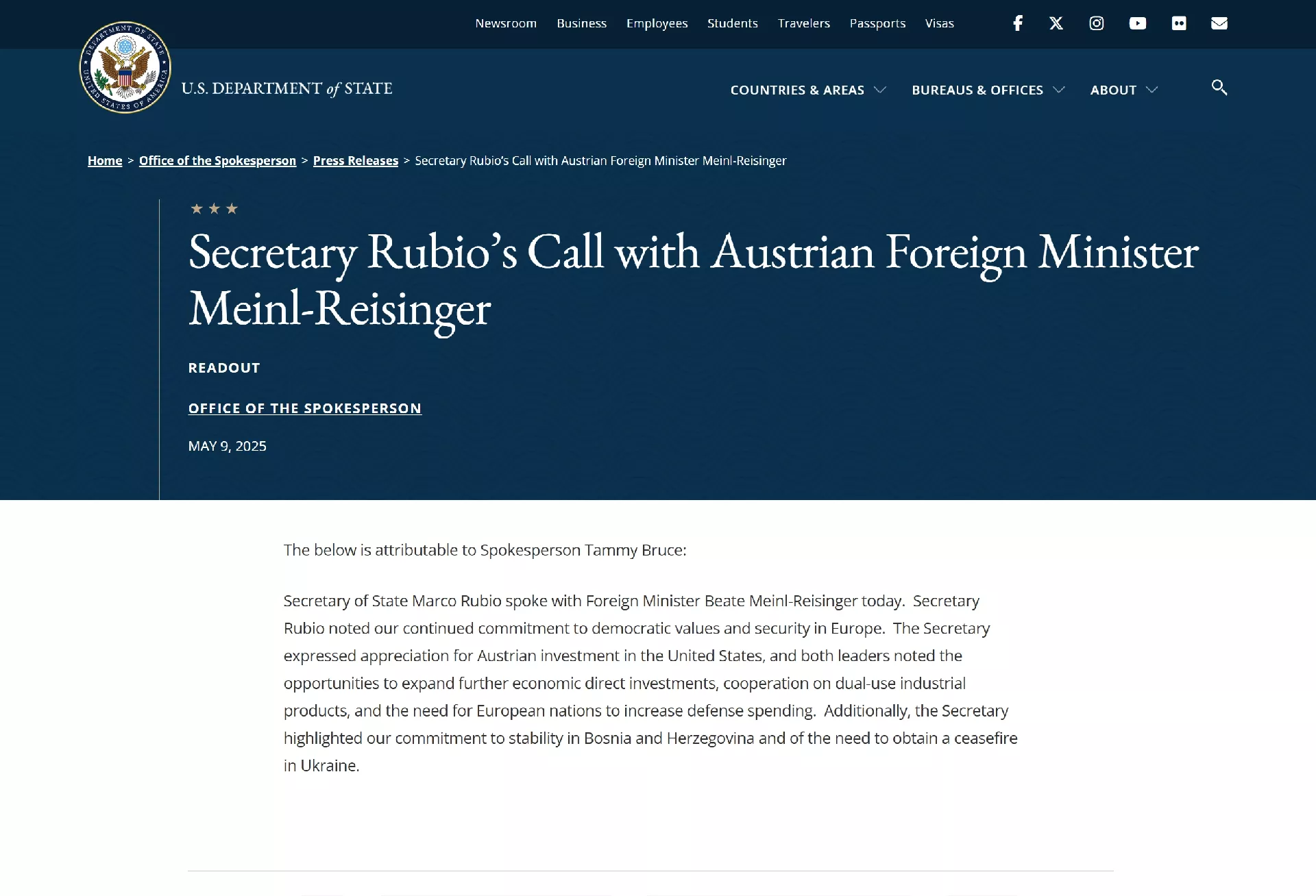 (Patria) - Američki državni sekretar Marco Rubio razgovarao je danas telefonom s austrijskom ministricom vanjskih poslova Beate Meinl-Reisinger.