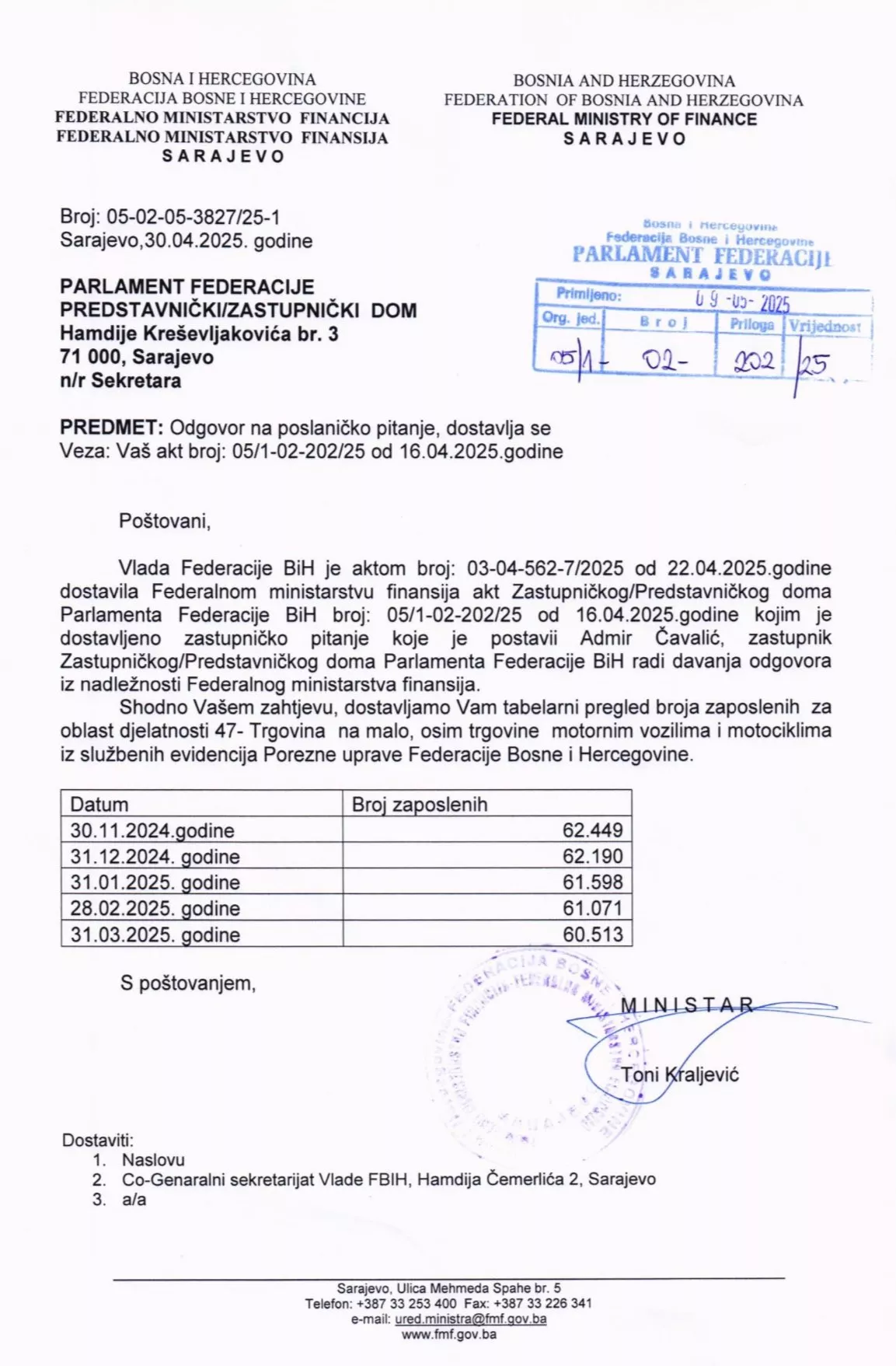 Ekonomista i zastupnik u Predstavničkom domu PFBiH Admir Čavalić objavio je podatke koje je dobio iz Ministarstva finansija FBiH o broju radnika u trgovini na malo.