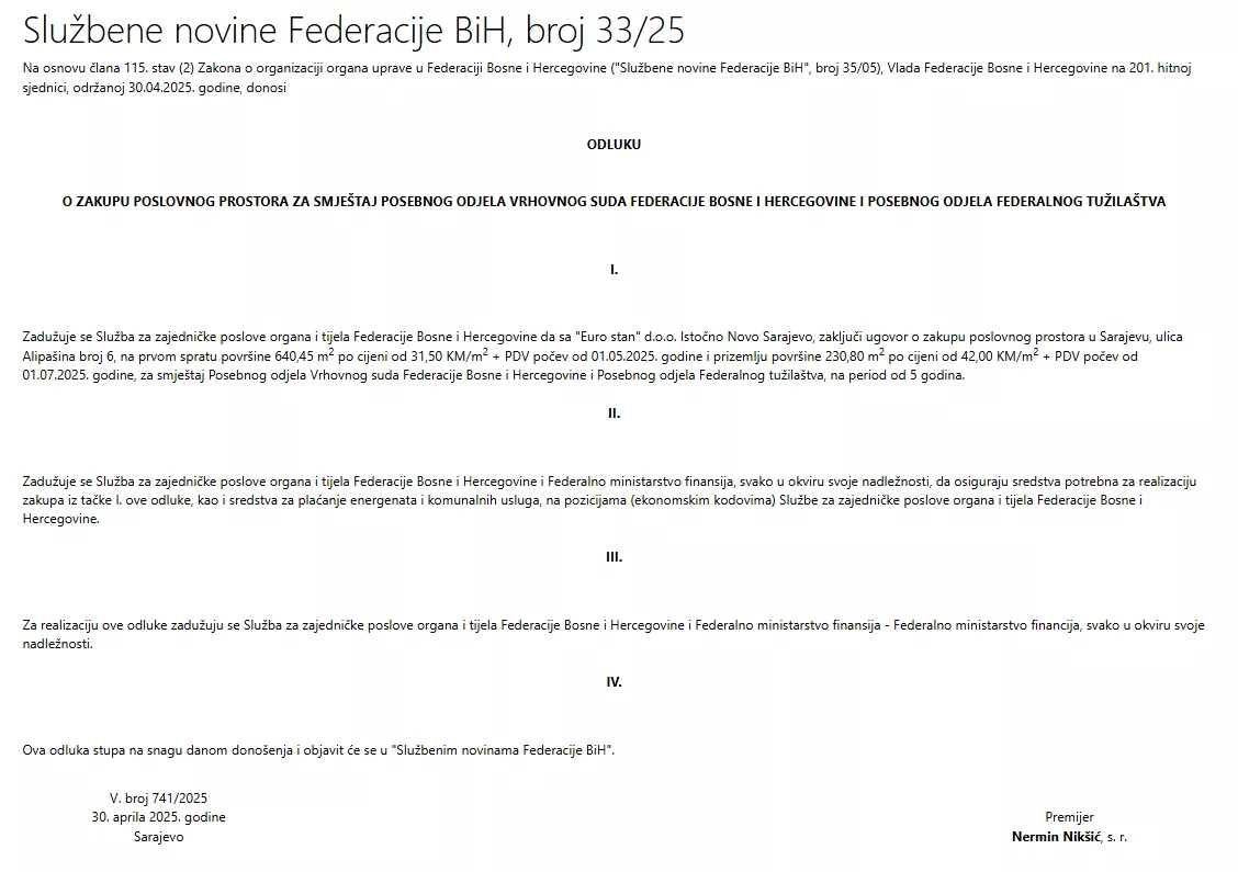 Služba za zajedničke poslove organa i tijela Federacije Bosne i Hercegovine sa firmom "Euro stan" d.o.o. Istočno Novo Sarajevo, zaključila je ugovor o zakupu poslovnog prostora u Sarajevu, ulica Alipašina broj 6, na prvom spratu površine 640,45 m2 po cijeni od 31,50 KM/m2 + PDV počev od 01.05.2025. godine i prizemlju površine 230,80 m2 po cijeni od 42,00 KM/m2 + PDV počev od 01.07.2025. godine, za smještaj Posebnog odjela Vrhovnog suda Federacije Bosne i Hercegovine i Posebnog odjela Federalnog tužilaštva, na period od 5 godina.