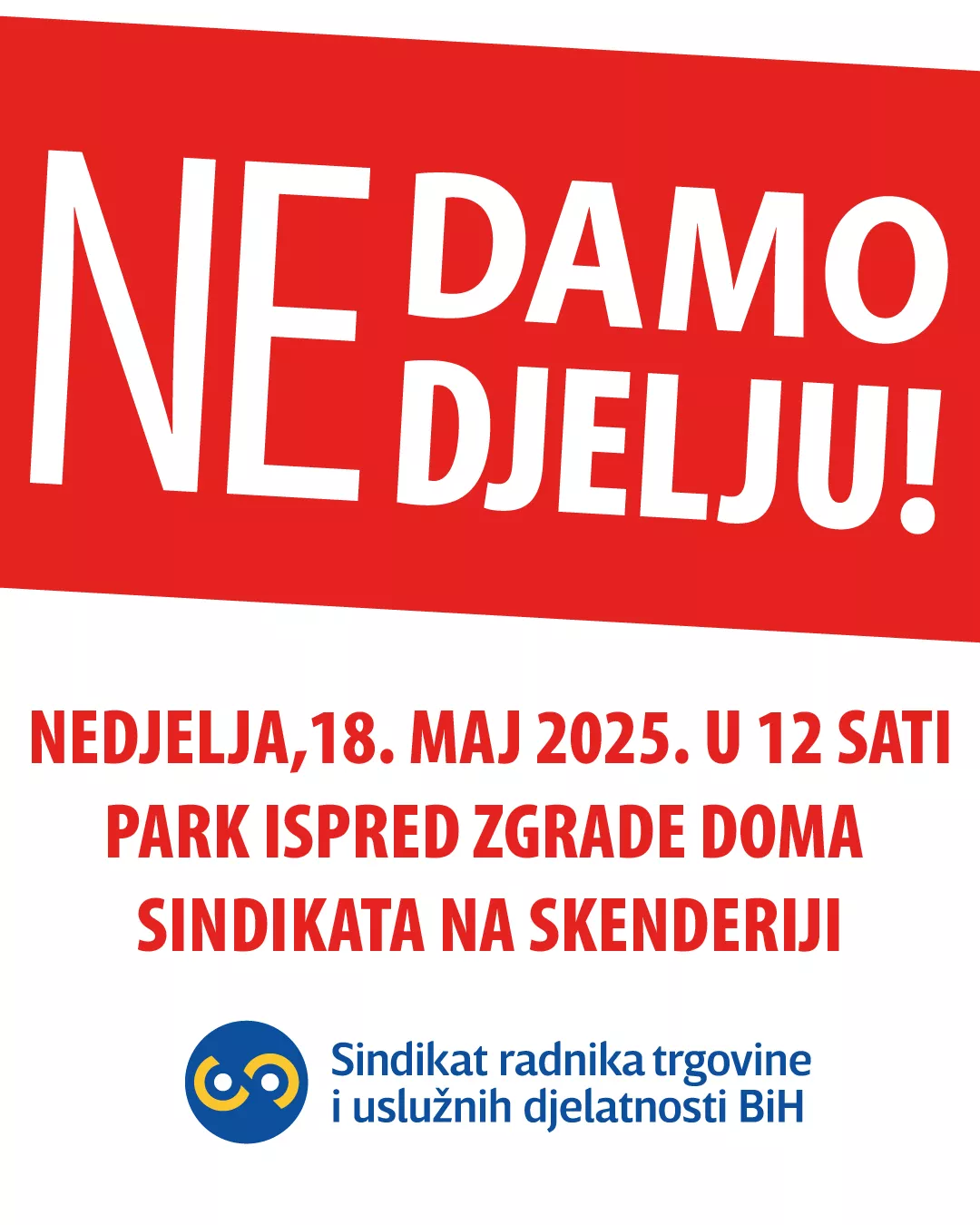 (Patria) - Sindikat radnika trgovine STBiH, odgovarajući na inicijativu koju su podnijeli radnici i radnice u trgovini, a putem STBiH društvenih mreža organizuje protestno okupljanje u nedjelju 18. maja s početkom u 12 sati. Protest će se održati u parku ispred zgrade Doma sindikata na Skenderiji.
