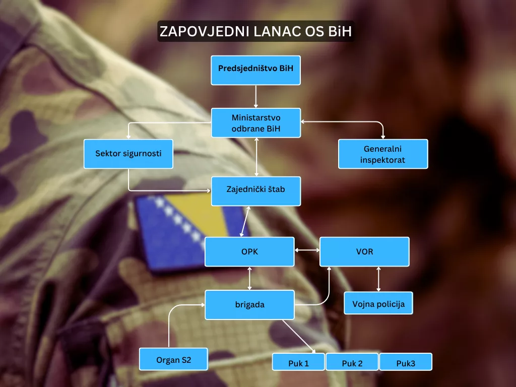 Za bolje razumijevanje načina funkcionisanja odbrambenog sektora, važno je znati da je Predsjedništvo BiH kolektivni vrhovni zapovjednik Oružanih snaga. Ministarstvo odbrane, kao civilni organ, naredbe Predsjedništva ili ministra prosljeđuje Zajedničkom štabu OS BiH (stručnom organu MO BiH i Predsjedništva), koji potom djeluje kao spona između Ministarstva i Operativne komande — vojnog izvršnog tijela.