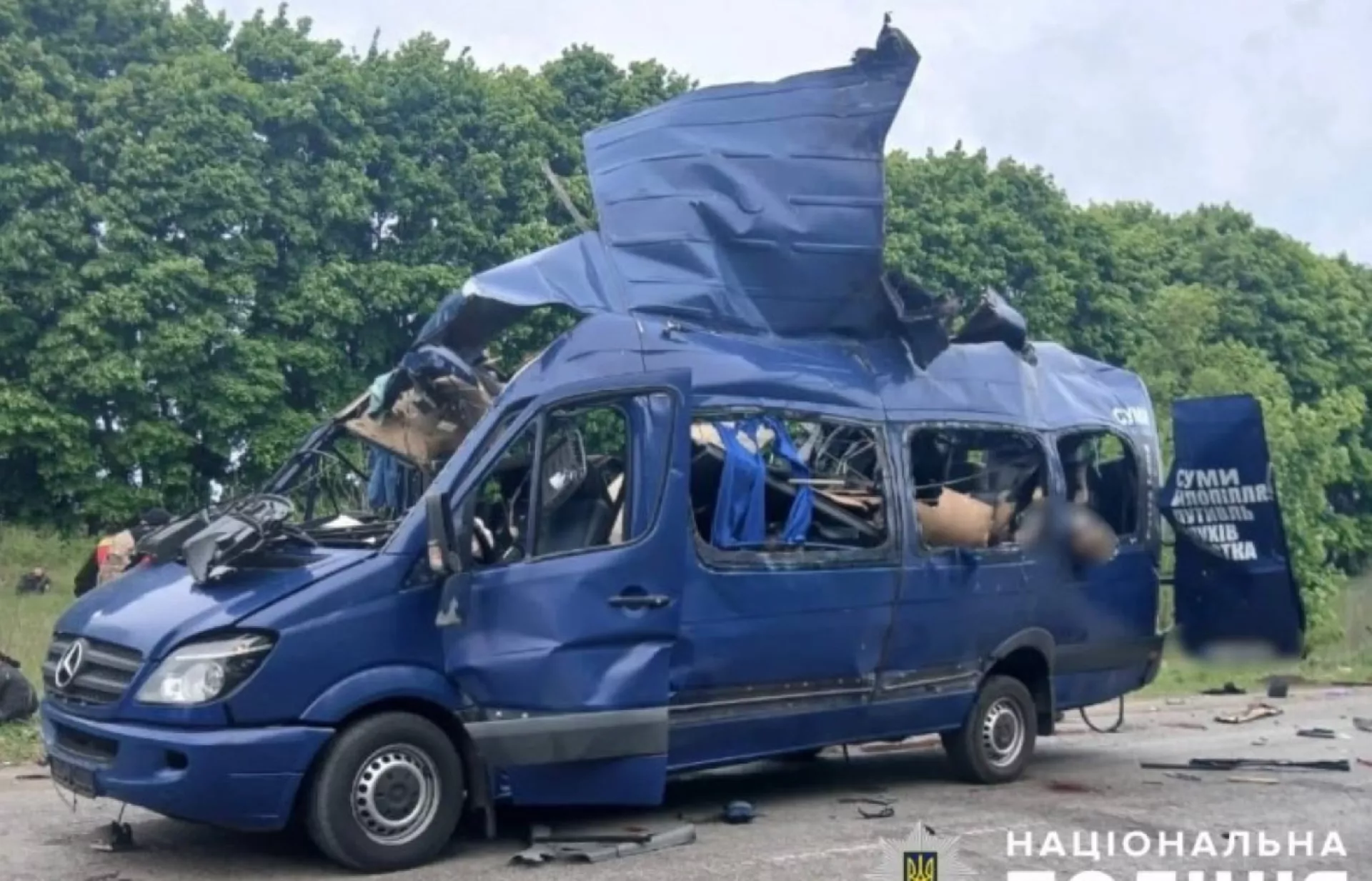Ukrajinska policija objavila je fotografije gotovo uništenog tamnoplavog putničkog kombija, s otkinutim krovom i razbijenim prozorima.
