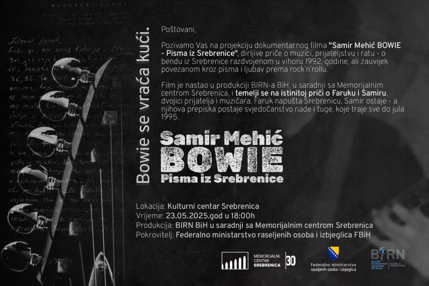 (Patria) - U Kulturnom centru Srebrenica danas će, s početkom u 18.00 sati, premijerno biti prikazan dokumentarni film o životu srebreničkog rock'n'roll gitariste pod nazivom "Samir Mehić Bowie - Pisma iz Srebrenice".