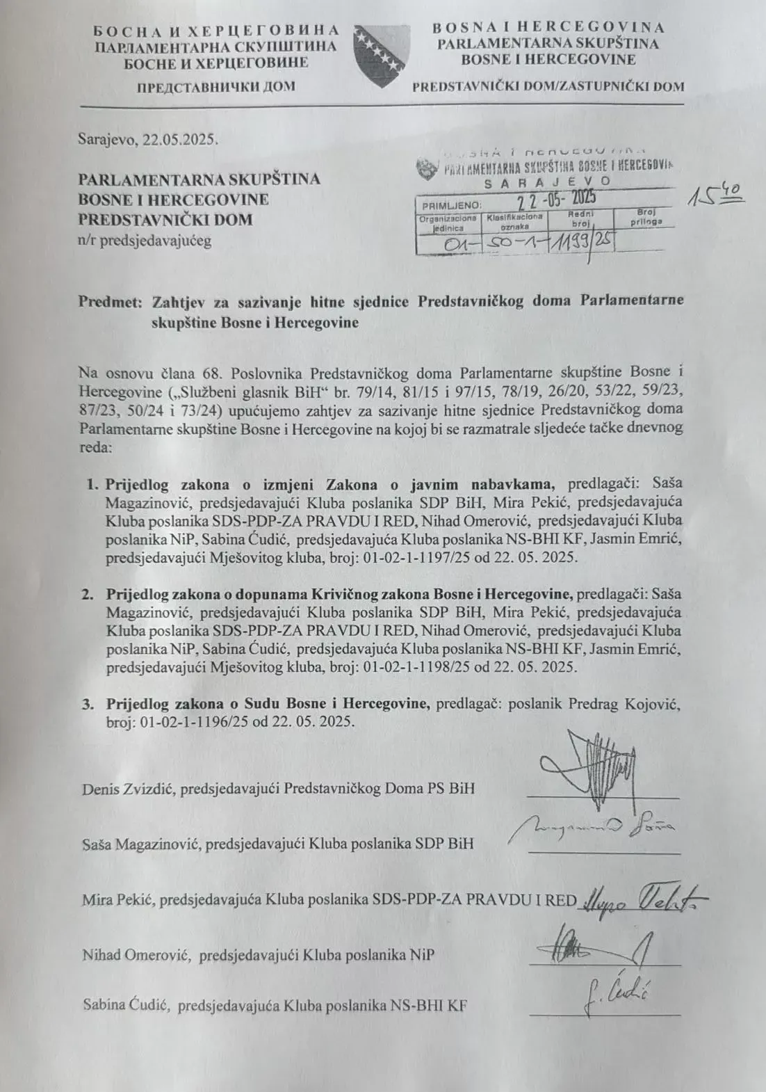 Grupa zastupnika iz više parlamentarnih klubova uputila je zvanični zahtjev za sazivanje hitne sjednice Zastupničkog doma, pozivajući se na član 68. Poslovnika o radu.