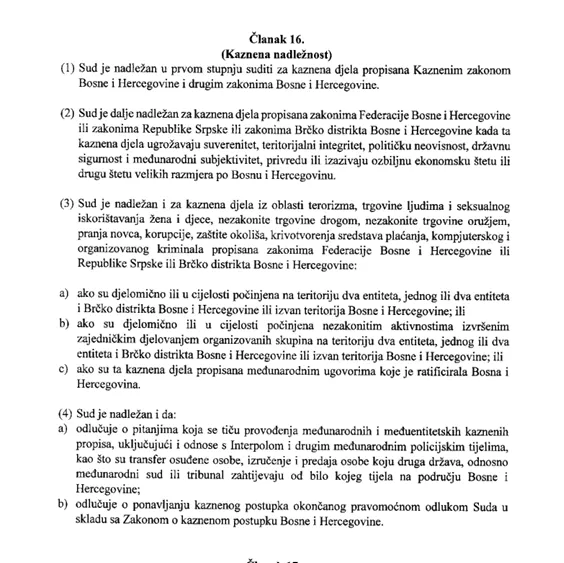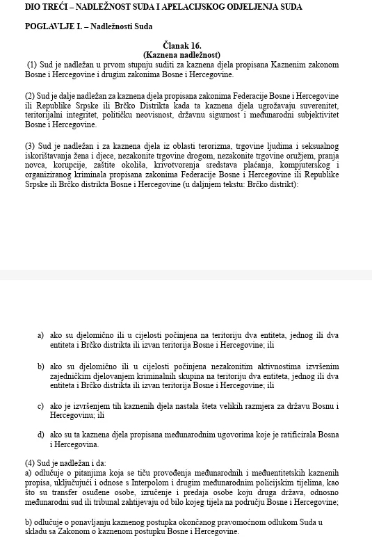 Ono što je sporno u sva tri prijedloga koja sada postoje jeste smanjenje nadležnosti Suda BiH, odnosno preciziranje određenih krivičnih djela koja bi sudio Sud BiH, dok bi sve ostalo radili entitetski odnosno niži sudovi.