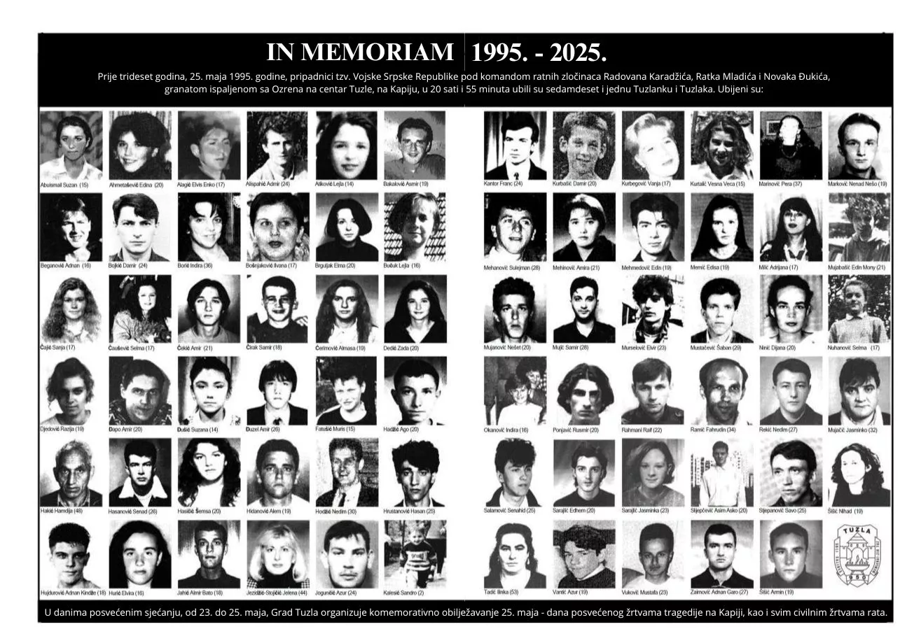 Centralna komemoracija bit će upriličena u nedjelju, 25. maja. Obilježavanje će započeti polaganjem vijenaca i cvijeća na Slanoj Banji, u znak poštovanja prema svim civilnim žrtvama rata, a potom će uslijediti komemoracija na Kapiji – mjestu stradanja tuzlanske mladosti. Tačno u 20.55 sati, u trenutku kada je 1995. godine ispaljena smrtonosna granata, oglasit će se sirena.