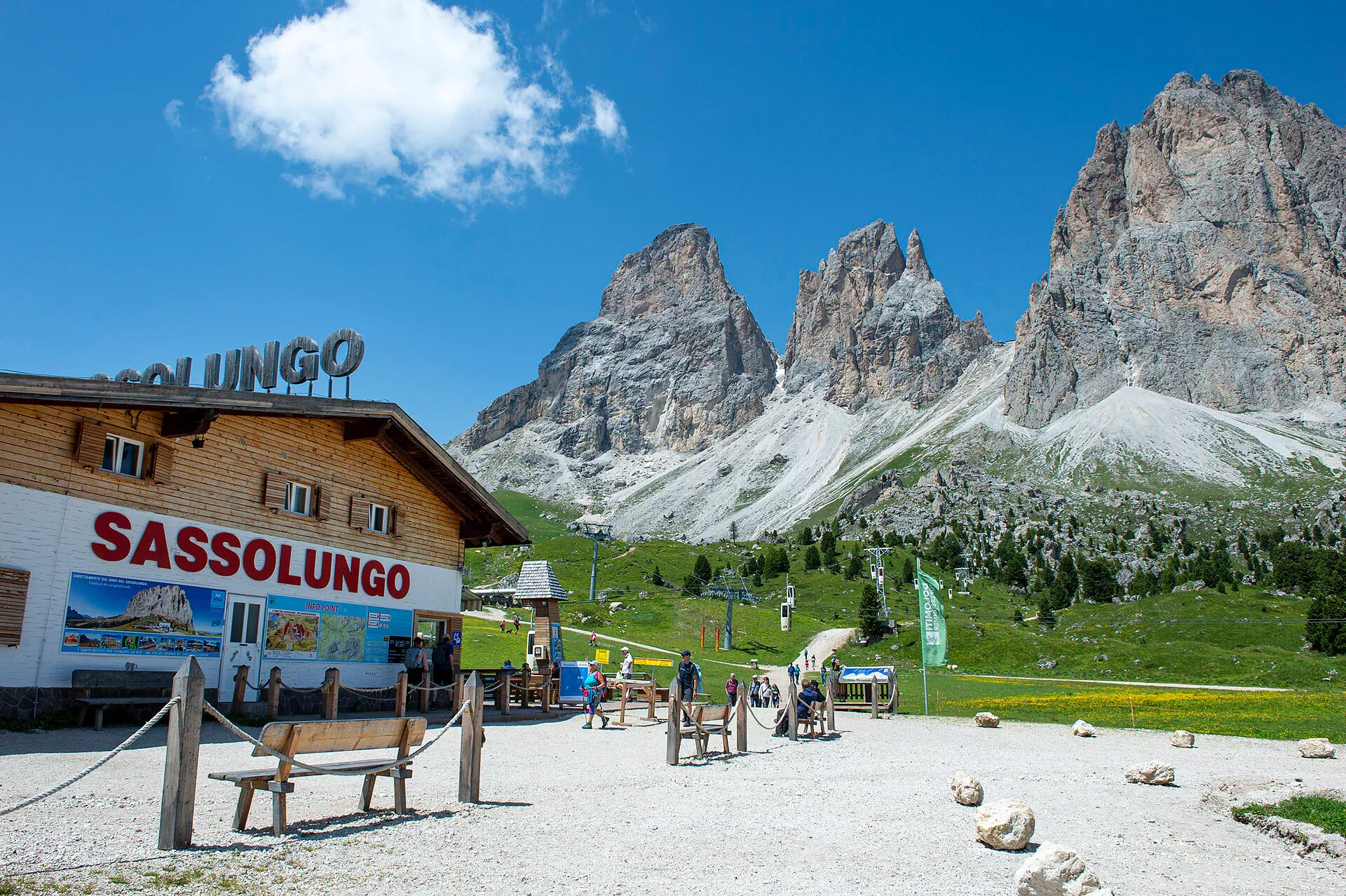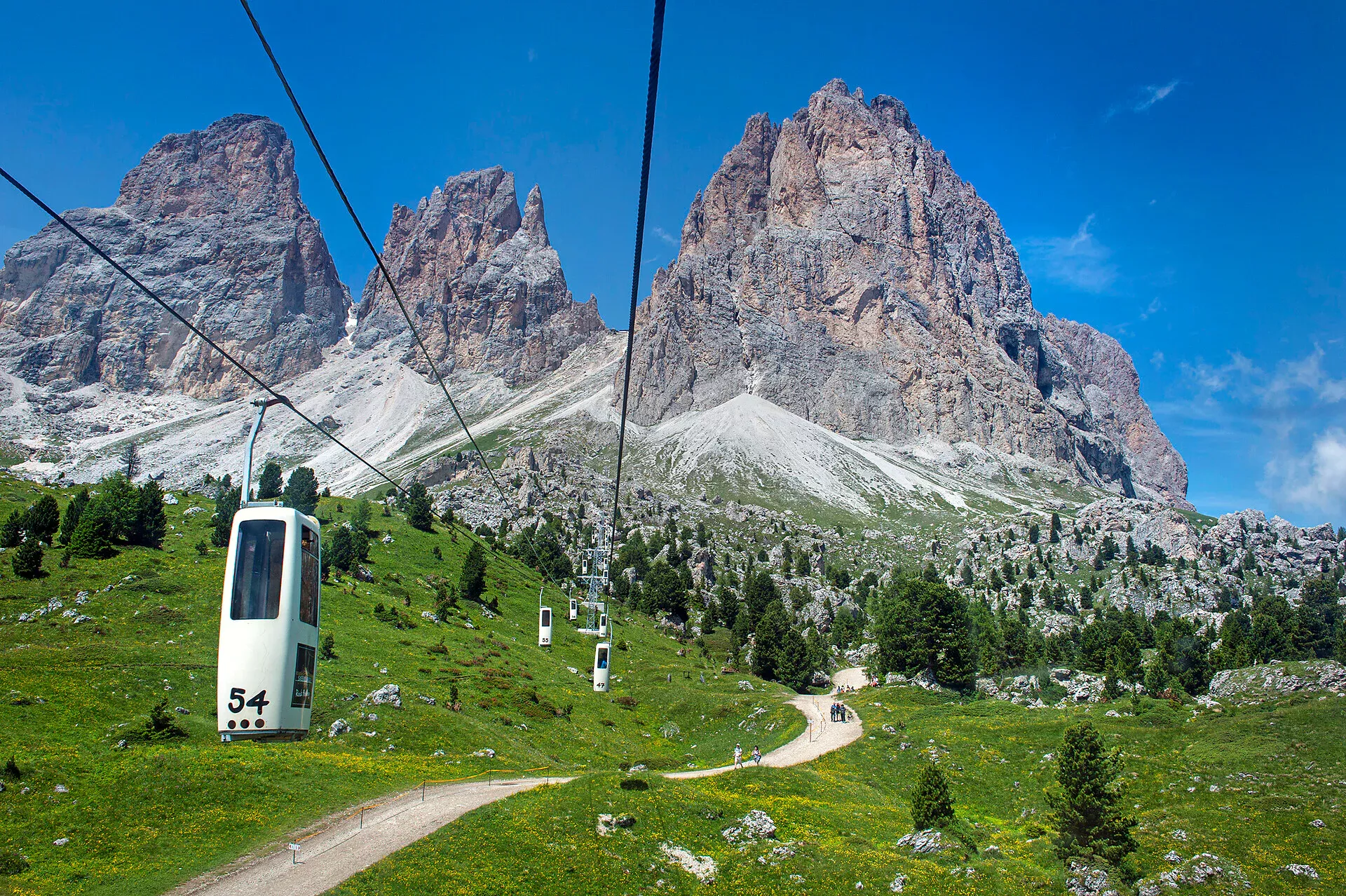 Telecabina Sassolungo vozi više od pedeset godina, od 1972., a prelazi visinsku razliku od gotovo 500 metara i udaljenost veću od kilometra i po.
