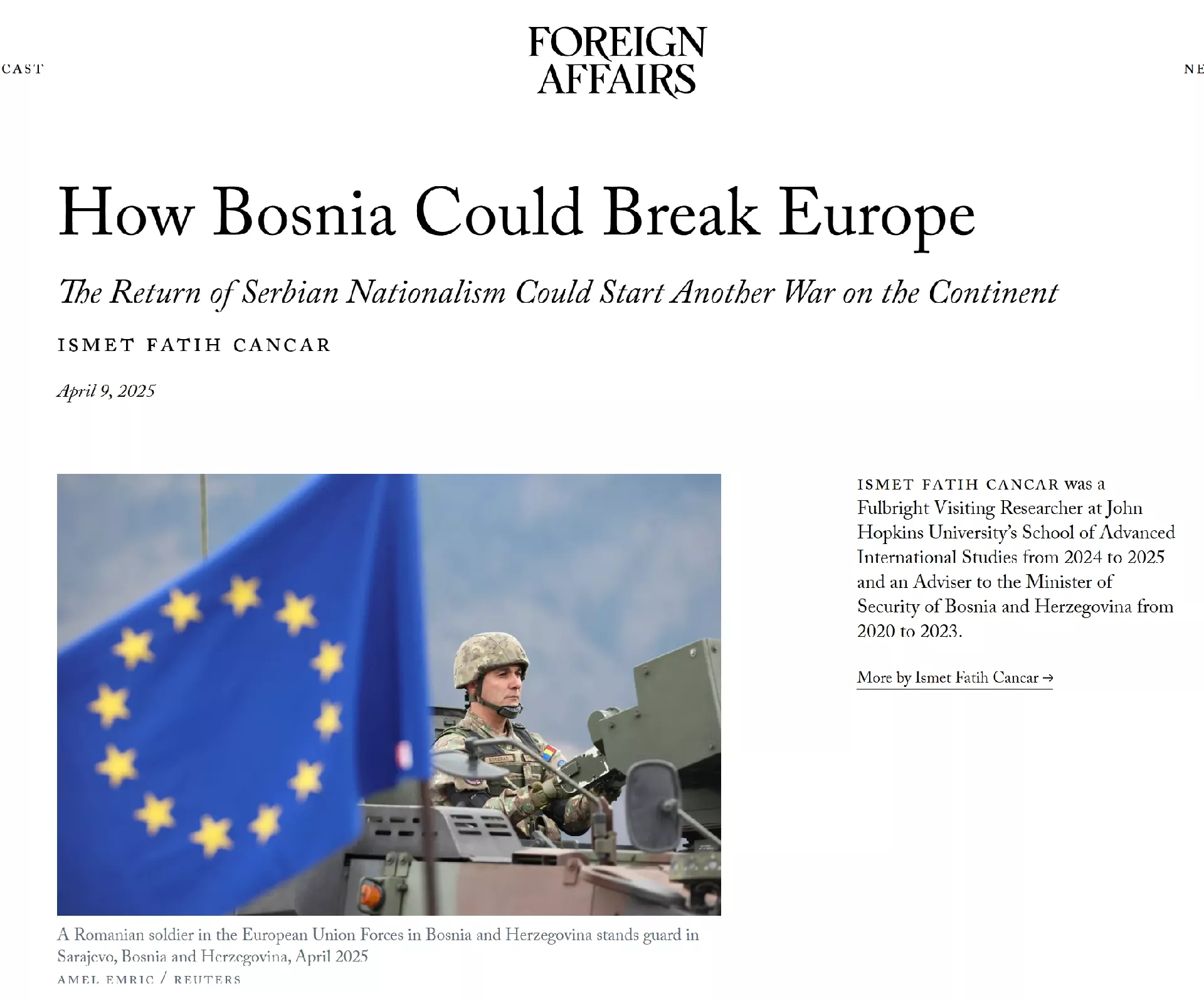 Kada se na stranicama ovog časopisa pojavio tekst Ismeta Fatiha Čančara, mladog bosanskohercegovačkog fulbrajtovca, sa naslovom "Kako Bosna može podijeliti Europu" (9. april 2025.) posve sigurno javnosti je poslato nekoliko važnih poruka.