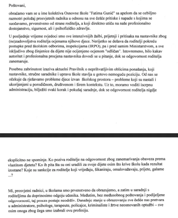 Upravo, prosvjetni radnici jedne osnovne škole u Sarajevu su javno podigli svoj glas i uputili apel relevantnim institucijama da se ozbiljno razmotri položaj prosvjetnih radnika u odnosu na sve češće pritiske i napade s kojima se suočavaju, prvenstveno od strane roditelja, a što direktno utječe na njihovo profesionalno dostojanstvo, sigurnost ali i psiho-fizičko zdravlje", navodi se iz Sindikata.