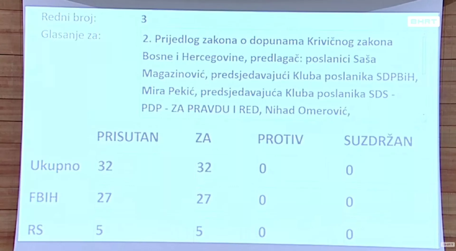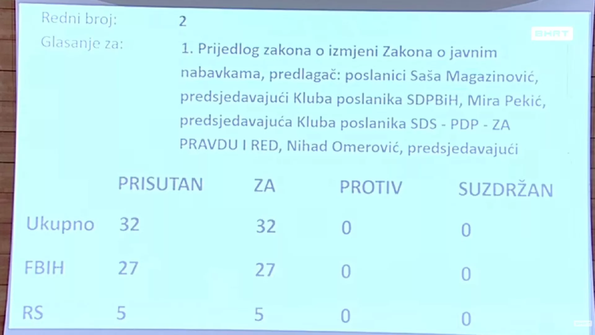 Oba zakonska rješenja - Prijedlog zakona o izmjeni Zakona o javnim nabavkama i Prijedlog zakona o dopunama Krivičnog zakona BiH - usvojena su jednoglasno.