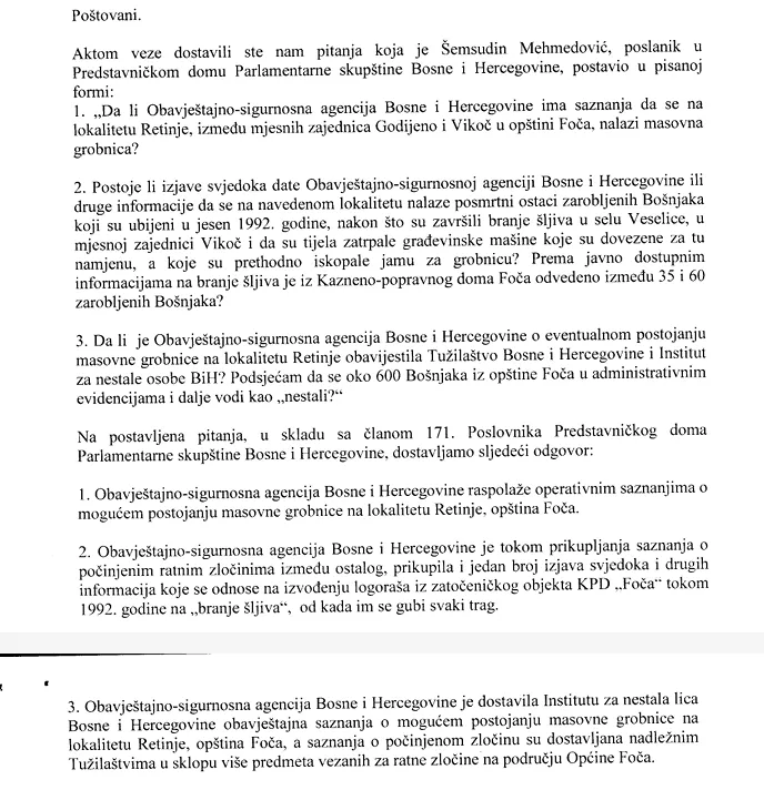 OSA je dostavila Institutu za nestala lica BiH obavještajna saznanja o mogućem postojanju masovne grobnice na lokalitetu Retinje, a saznanja o počinjenom ratnom zločinu su dostavljena nadležnim tužilaštvima u sklopu više predmeta vezanih za ratne zločine na području općine Foča", navodi se u odgovoru.