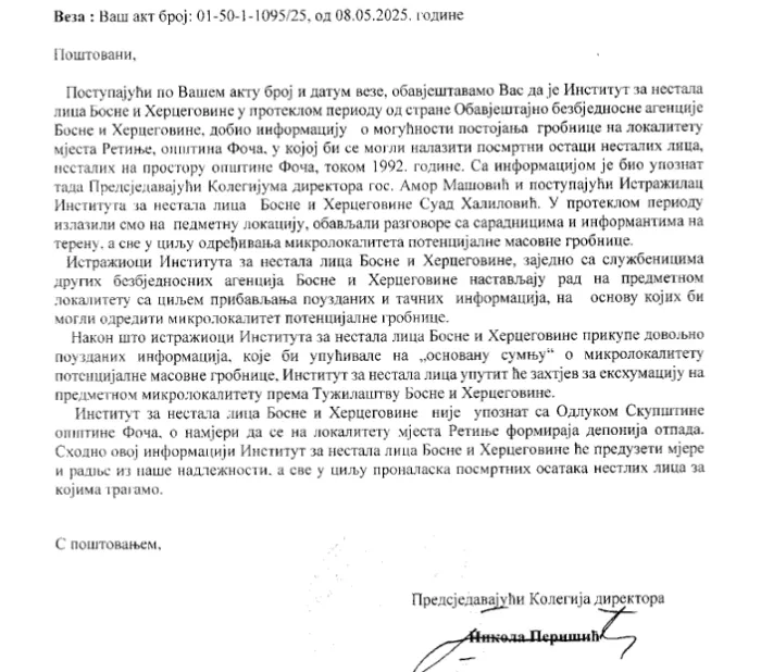Perišić Mehmedovića obavještava da nije upoznat s informacijom da se na tom lokalitetu formira deponija otpada, ali da će preduzeti sve radnje u cilju pronalaska nestalih lica za kojima se traga.