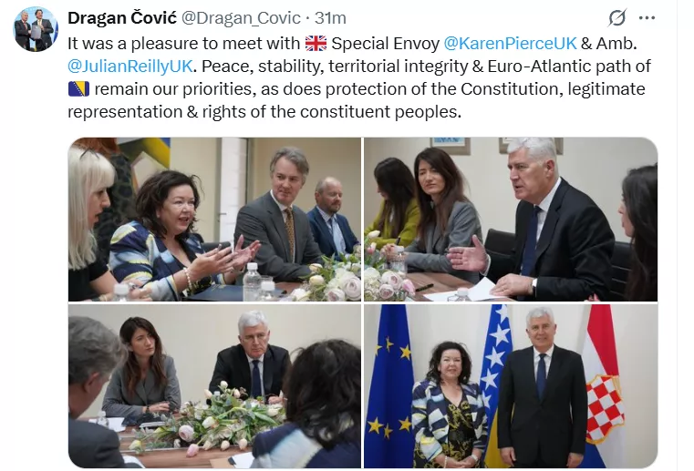 "Pronalaženje rješenja za trenutnu situaciju odgovornost je političkih lidera u BiH. UK podržava hitno formiranje koalicije na državnom nivou usmjerene na zaštitu interesa svih građana. Važan razgovor sa Draganom Čovićem o ovom pitanju", naveo je ambasador Reilly.