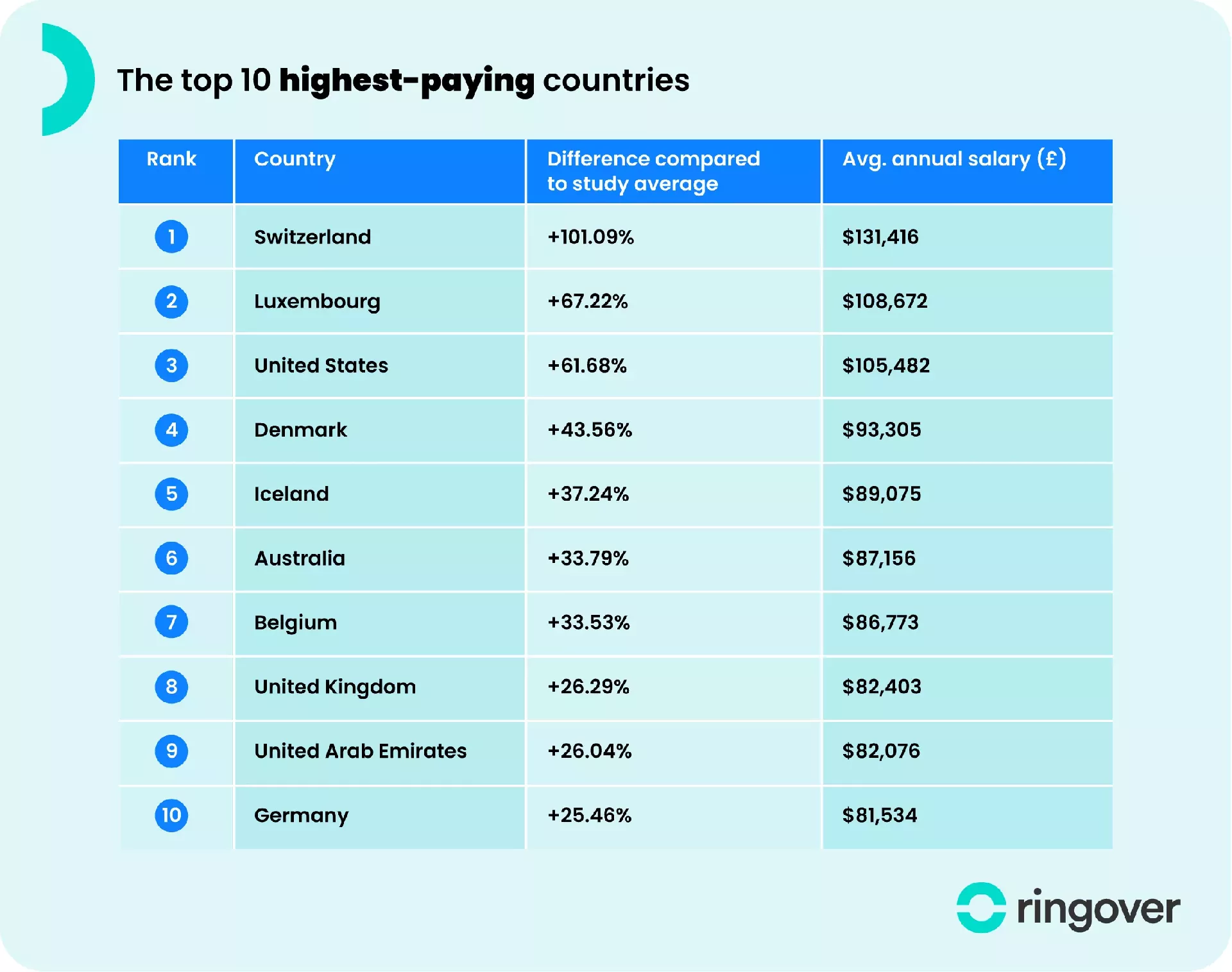 Na ljestvici deset zemalja s najvišim platama većina potječe iz Evrope. Izuzev Švicarske i Luksemburga, među najplaćenijim stanovnicima svijeta su Danci, Islanđani, Belgijanci, Britanci i Nijemci.