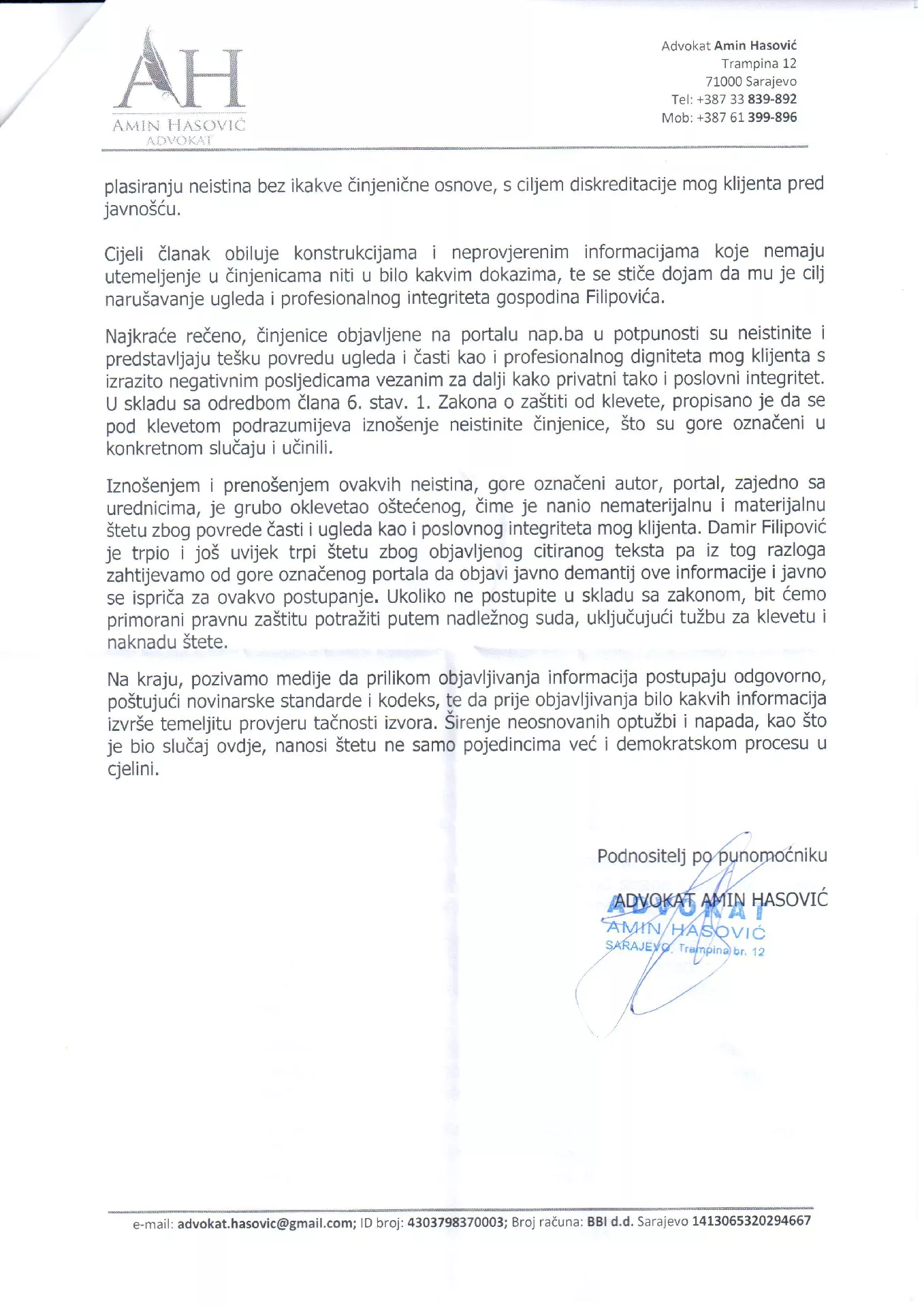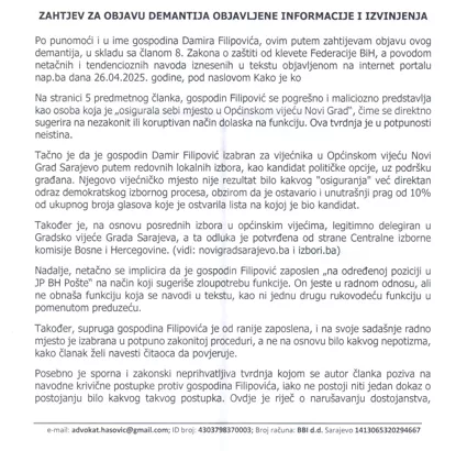 (Patria) - Advokat Damira Filipovića, Amin Hasović, uputio je Novinskoj agenciji Patria zahtjev za objavu demantija na navode iznesene u tekstu Nermina Alihodžića objavljenog na portalu Patrije "Kako je kompletno rukovodstvo SDP-a Novi Grad zaposlilo sebe i bračne drugove?" od 26.04.2025. godine.