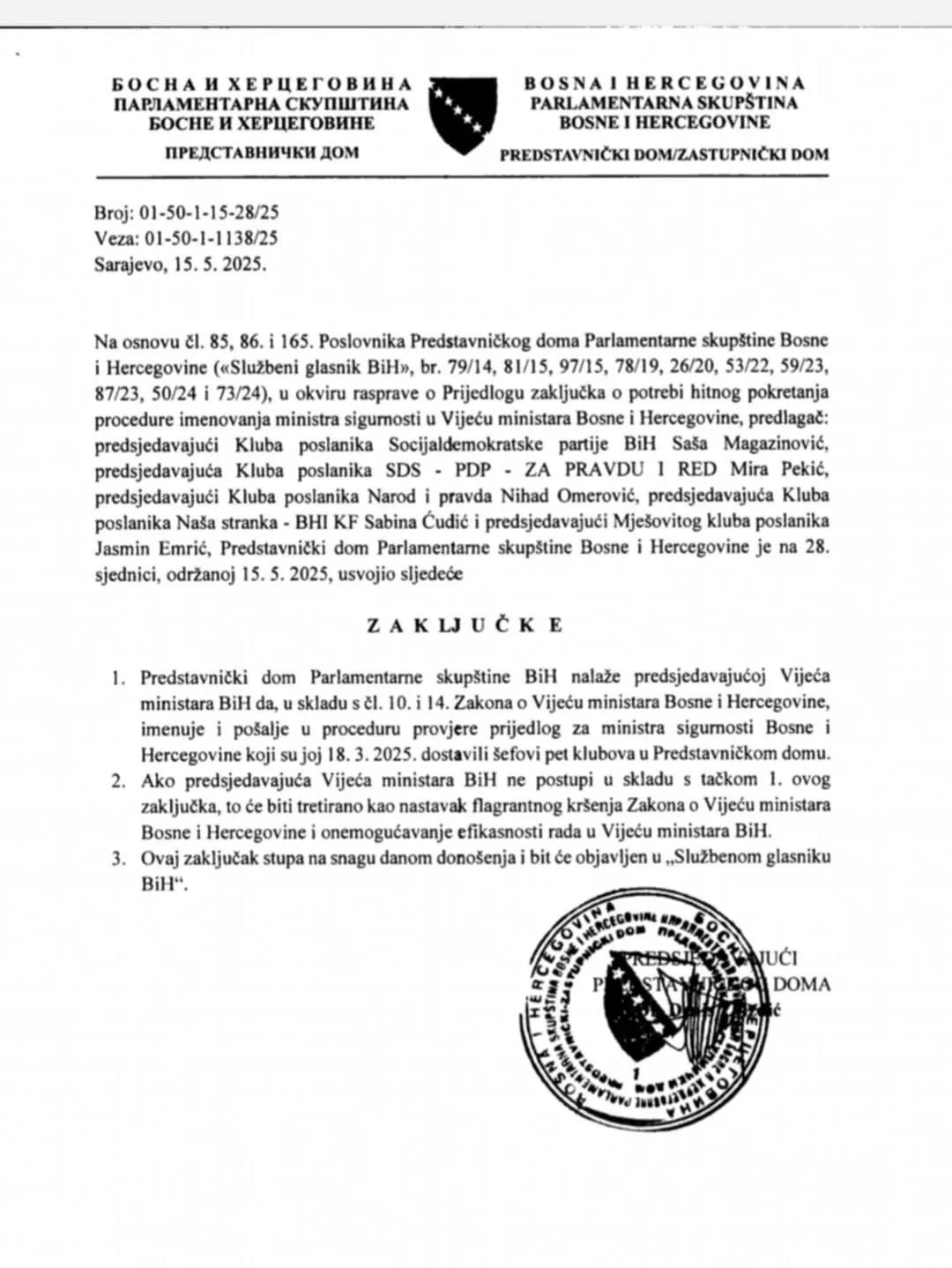 1. Predstavnički dom Parlamentarne skupštine BiH nalaže predsjedavajućoj Vijeća ministara BiH da, u skladu s čl. 10. i 14. Zakona o Vijeću ministara Bosne i Hercegovine, imenuje i pošalje u proceduru provjere prijedlog za ministra sigurnosti Bosne i Hercegovine koji su joj 18. 3. 2025. dostavili šefovi pet klubova u Predstavničkom domu.