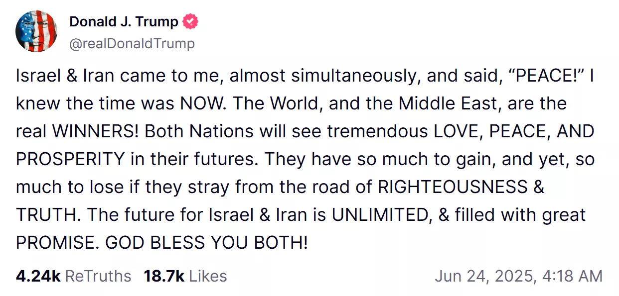 "Izrael i Iran došli su k meni, gotovo istovremeno, i rekli: 'MIR!' Znao sam da je vrijeme upravo sad. Svijet i Bliski istok su pravi POBJEDNICI!