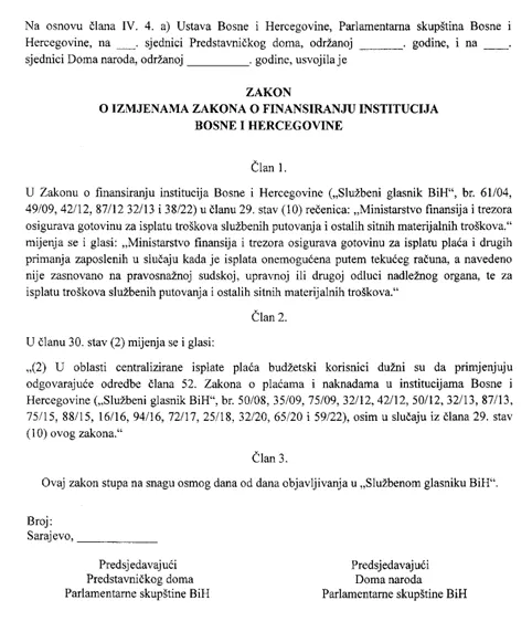Na dnevnom redu je ponovo Prijedlog zakona o izmjenama Zakona o finansiranju institucija Bosne i Hercegovine čiji je predlagač poslanik Marinko Čavara (HDZ BiH), a nakon što je Dom naroda PS BiH oborio ovaj zakon 5. juna. On je 11. juna ponovo uputio u proceduru zakon, a predloženim izmjenama predviđa se isplata plaće i naknada u gotovini kada to nije moguće putem transakcijskog računa.