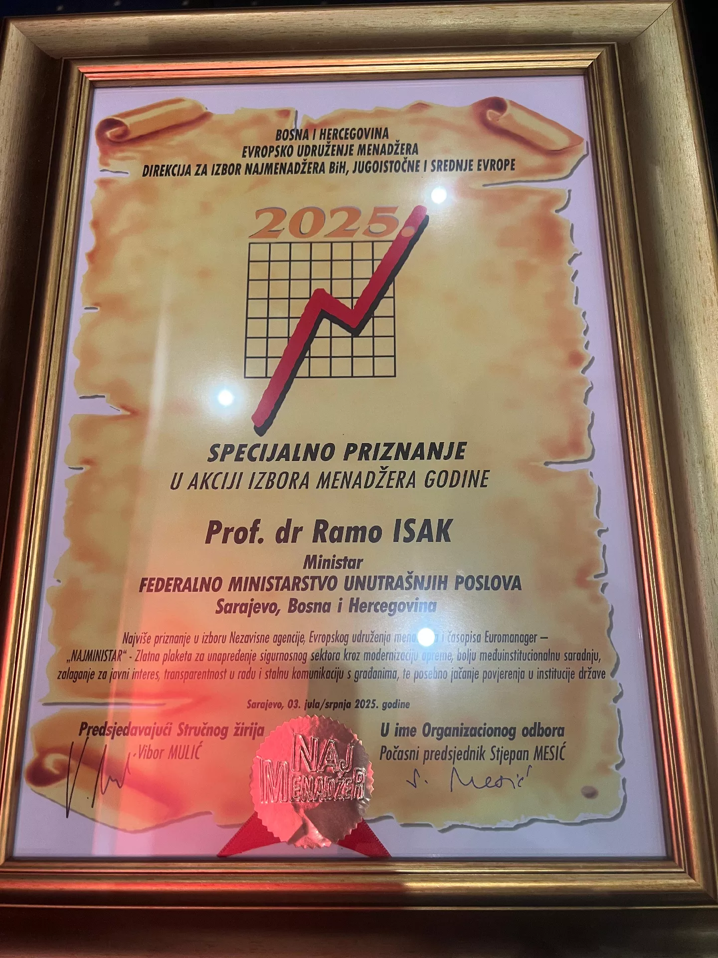 Ovo priznanje posvećujem njima, ali i svim zaposlenima u sigurnosnom sektoru koji svakodnevno rade u službi građana. Nastavljamo još jače i odlučnije raditi za sigurniju i pravedniju Bosnu i Hercegovinu - poručio je Isak.