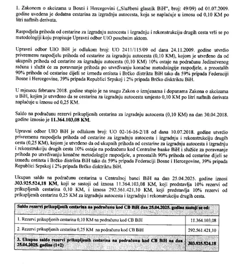 I dok je u zastoju usvajanje Budžeta institucija BiH za 2025. godinu, te se traži način kako platiti dug po presudi Viaduct u iznosu od 112 miliona KM, a danas moguće i u većem iznosu, novac od cestarina ostaje neraspoređen.